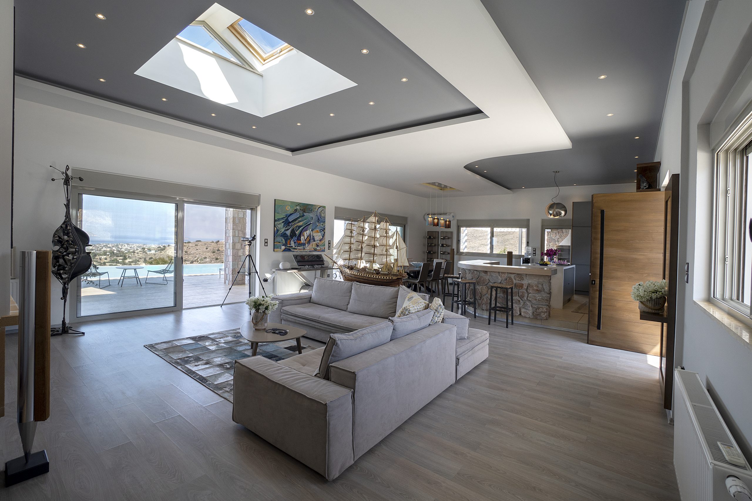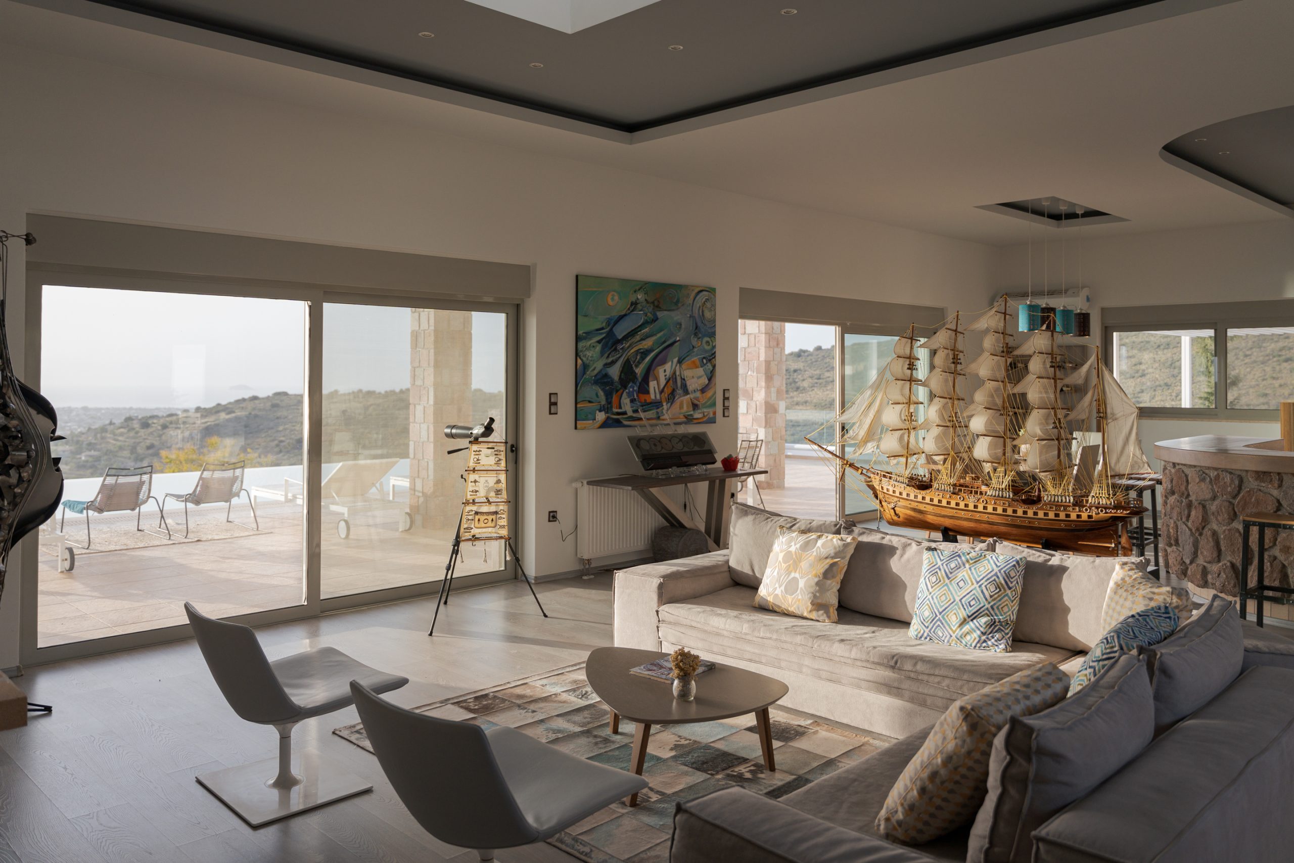 Perched high on a lush green hillside in the southwest of Aegina Island, Villa Enopia is an exceptional private estate offering space, privacy, and breathtaking panoramic views across the Saronic Gulf. Spanning more than 700m² of beautifully designed living areas, the villa combines impressive scale with warm hospitality, creating the perfect setting for unforgettable gatherings with family and friends.