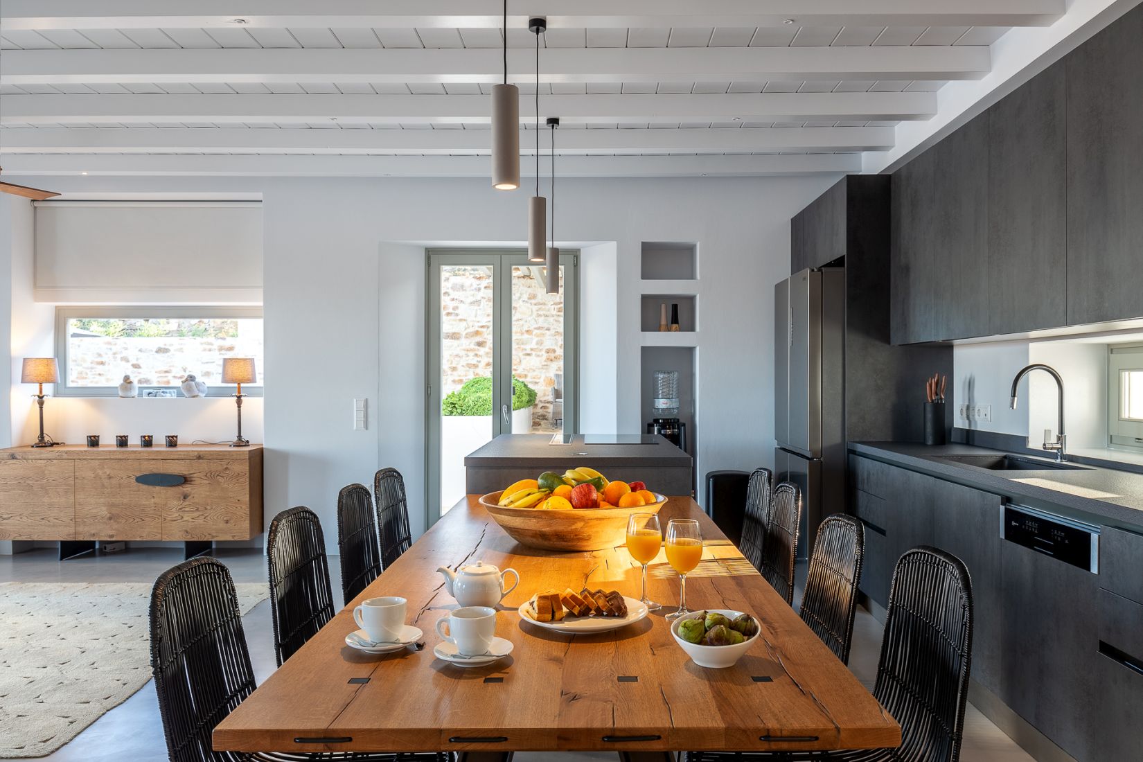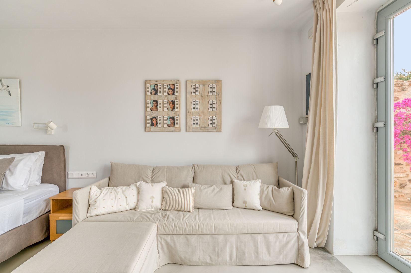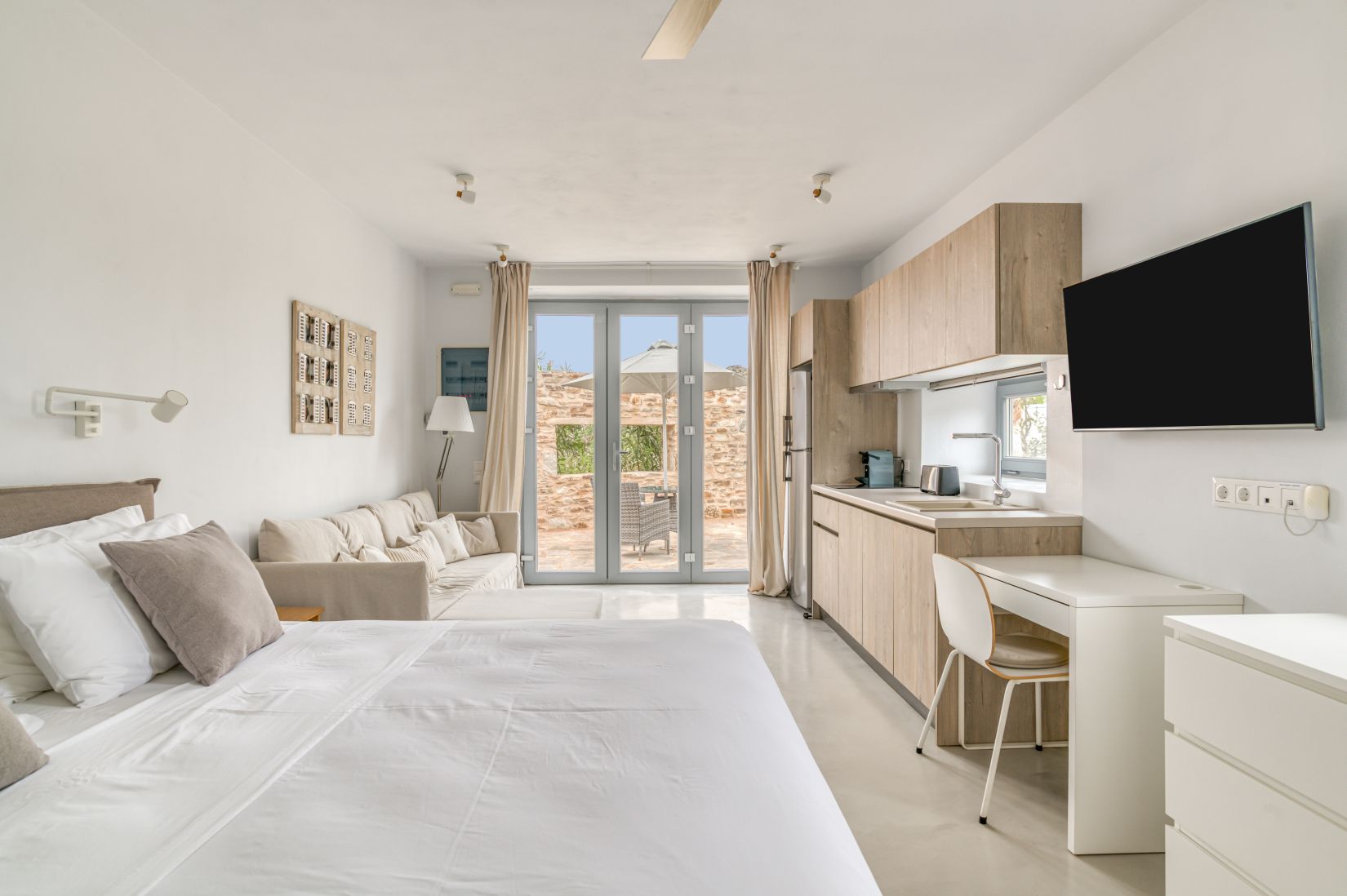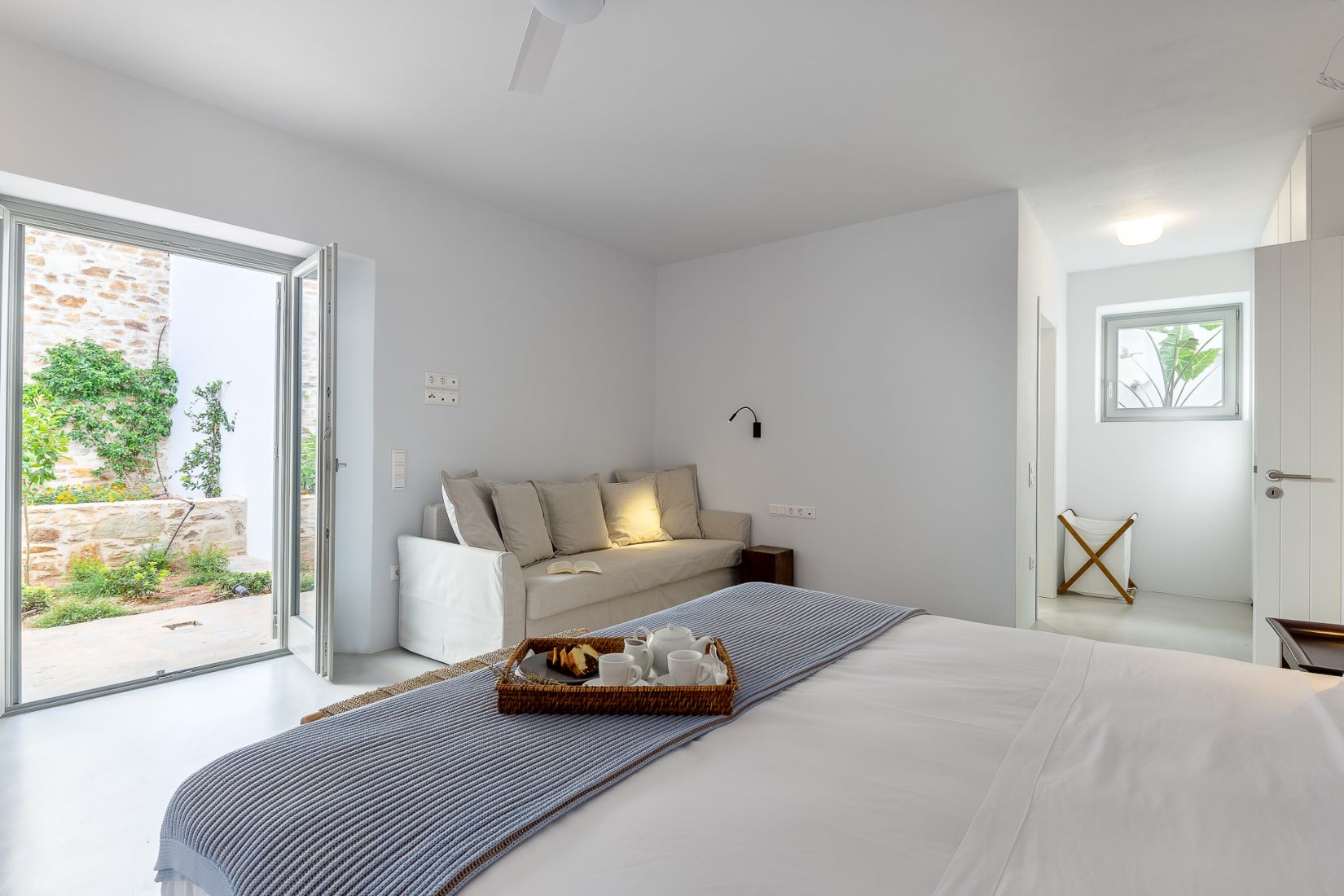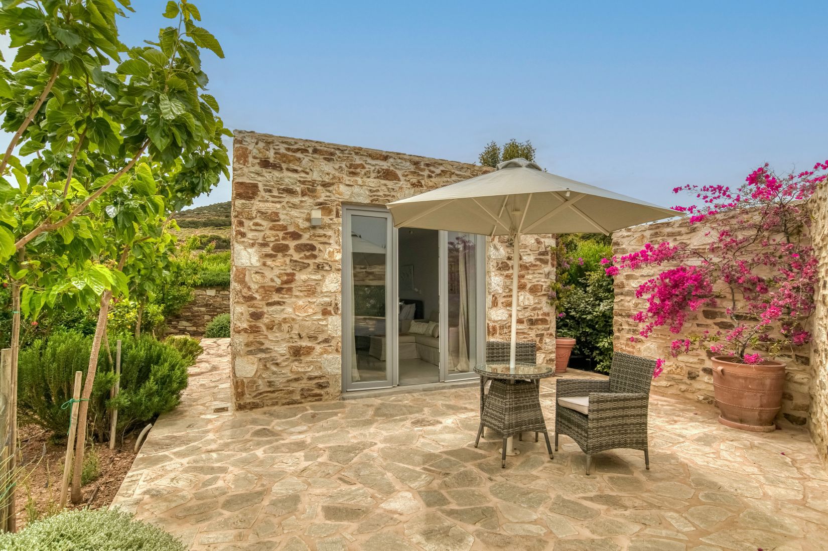 Located approximately 60 meters from the main villa and connected by a stone-built pathway, the independent guest house offers complete privacy. It features a king-size bed, comfortable sitting area, fully equipped kitchenette, en-suite bathroom, laundry facilities, and a secluded private garden with outdoor seating. The guest house may be included or kept vacant upon request.