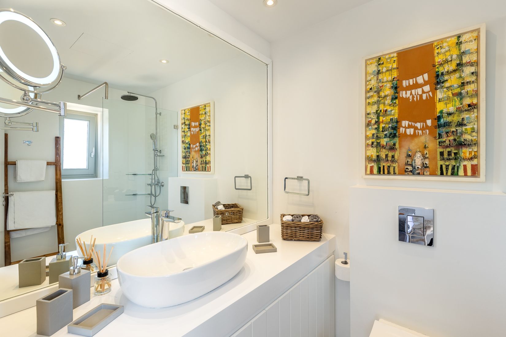 The ground floor features a bright and expansive open-plan living and dining area, complemented by a fully equipped, state-of-the-art kitchen. Two east-facing guest bedrooms with king-size beds and en-suite bathrooms complete this level, each enjoying direct access to outdoor areas.