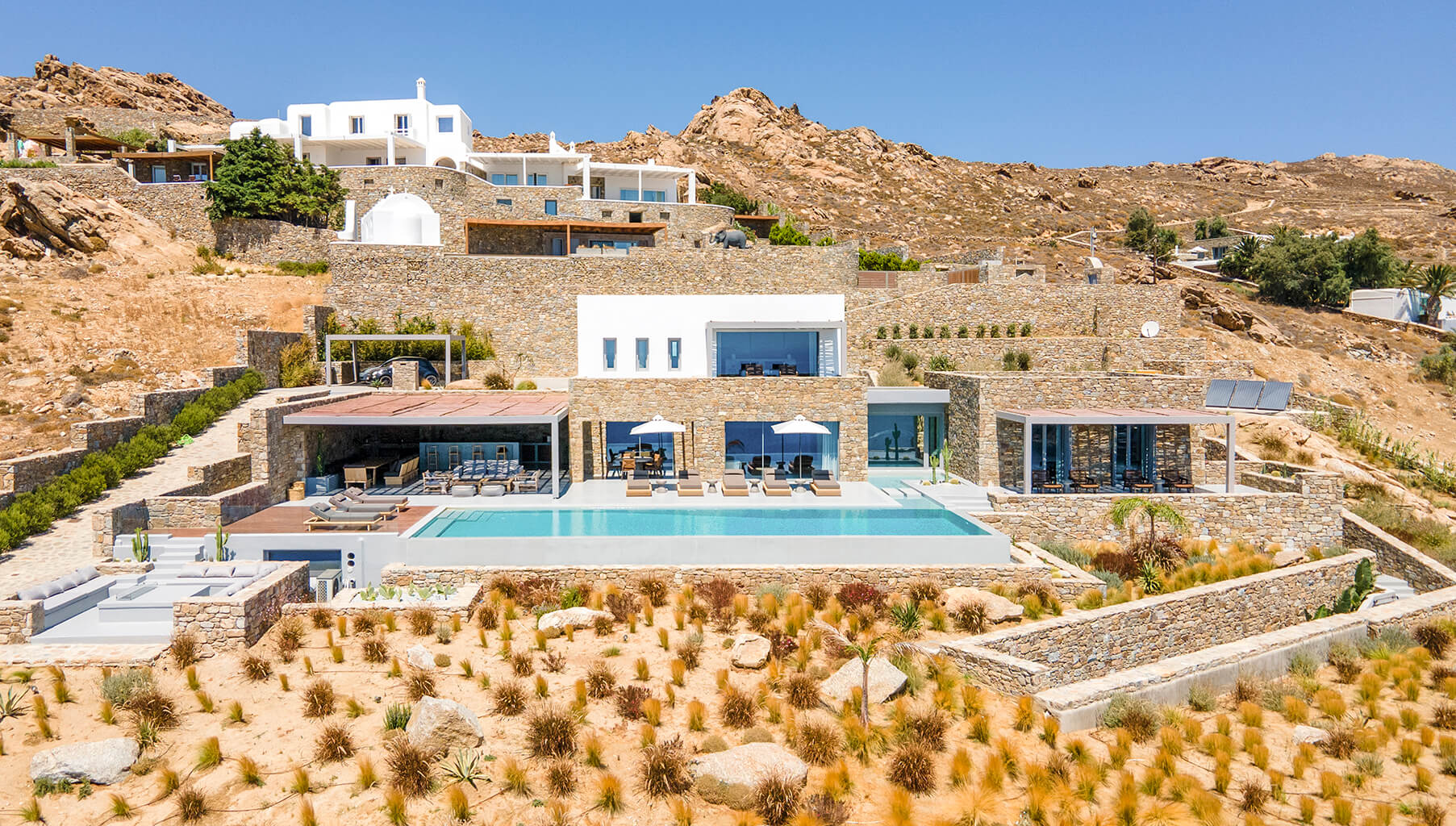 Entrance floor: well-designed infinity pool [82 sqm] with Jacuzzi and connected shallow pool water [heated upon extra charge], outdoor kitchen with gas stove, built in-BBQ, fridges, and wine fridge, bar with high chairs, outdoor dining area [12 seats], loungers and lounge areas, some stairs leading to a built-in lounge area with open plan fireplace, helipad, outdoor showers.