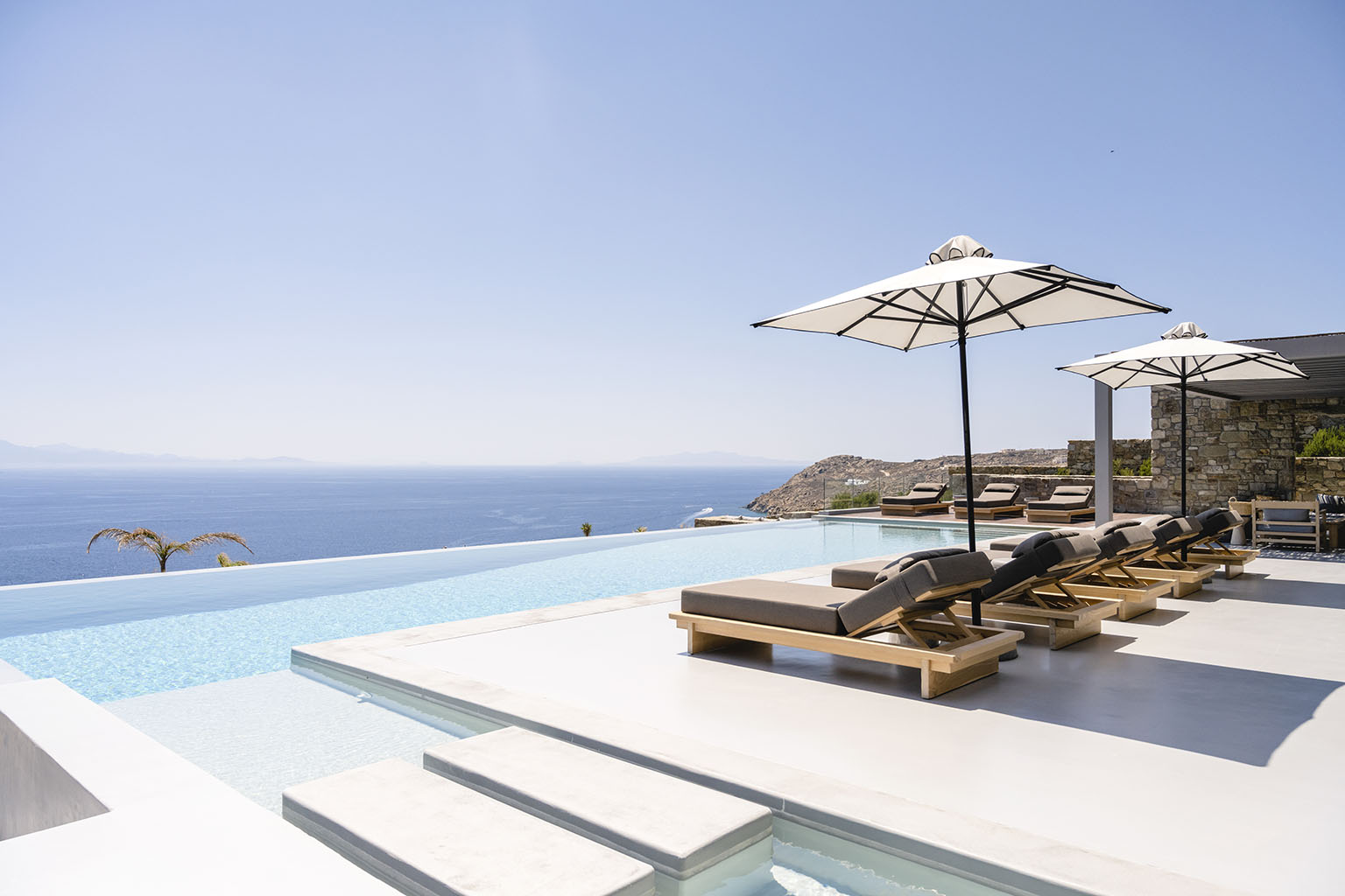 Independent Unit 2: open plan fully equipped kitchen, living room with panoramic sea-view and access to an outdoor built-in lounge area, outdoor dining area [6 seats], heated Jacuzzi [6 seats].