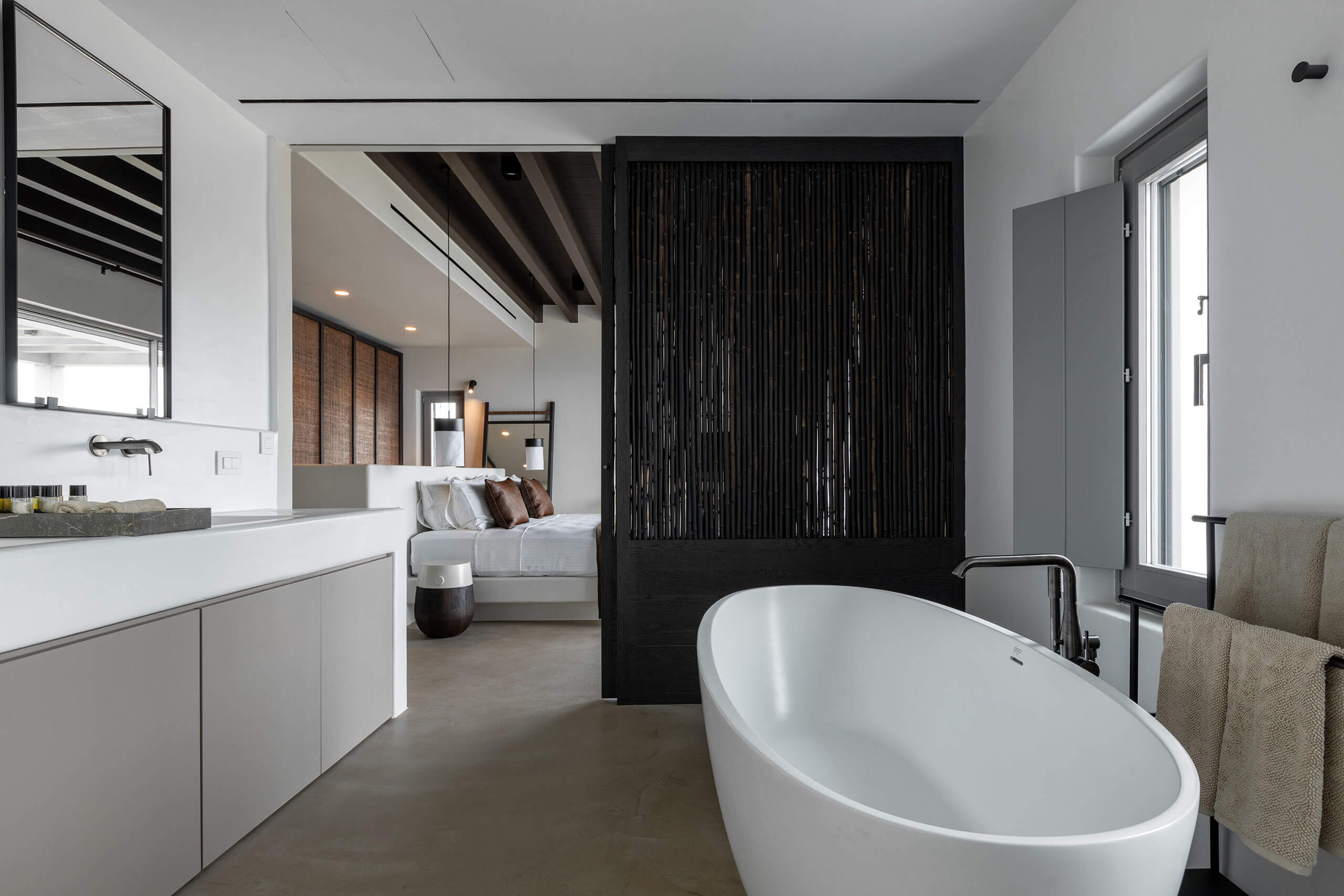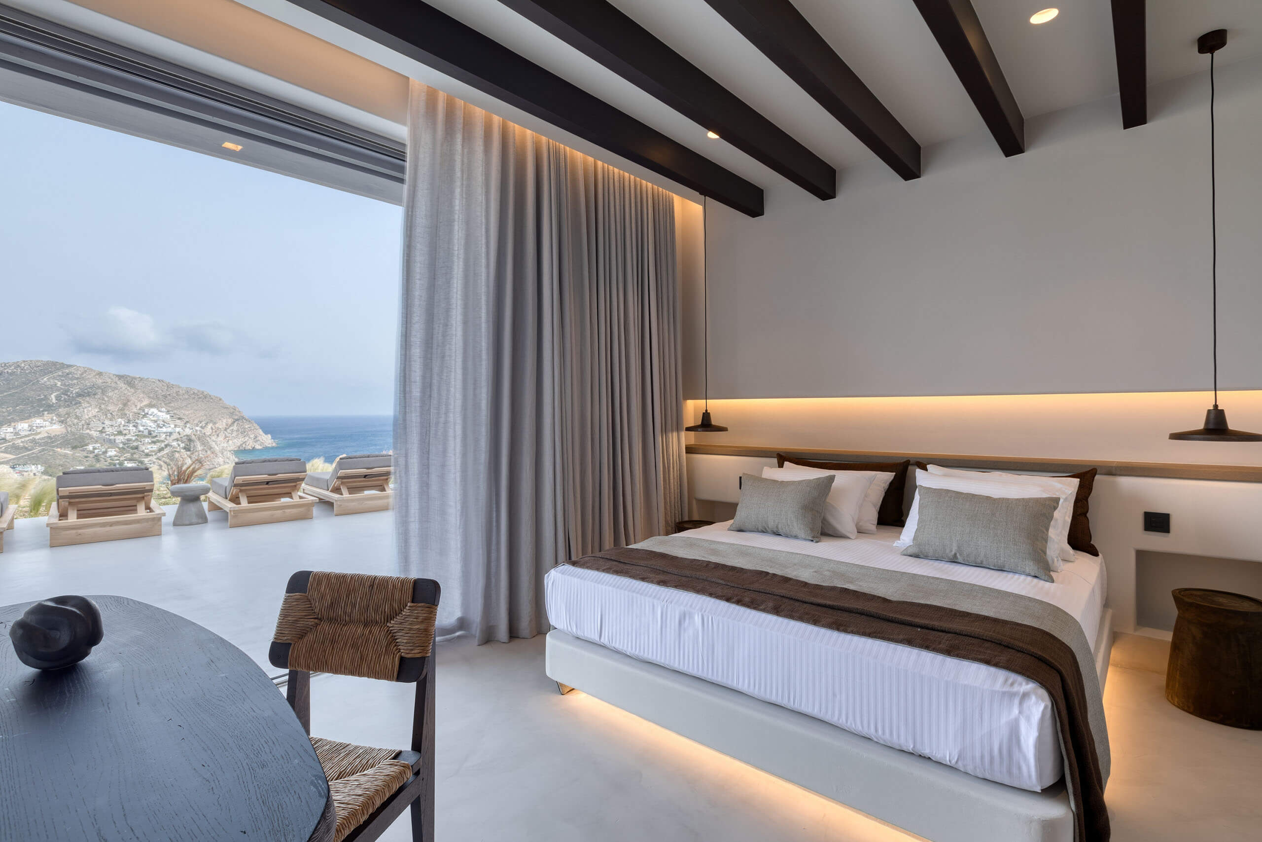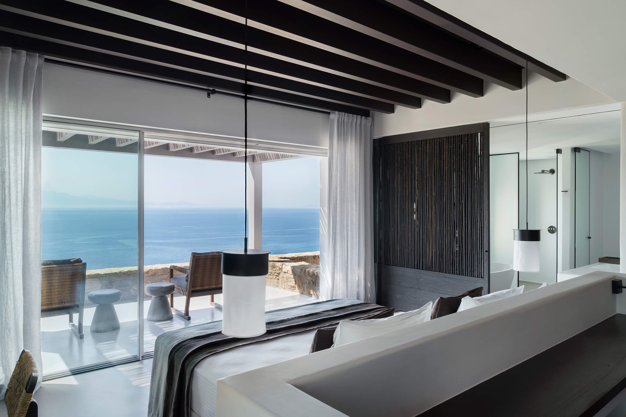 Suite 3: master bedroom with queen-size bed, TV, open plan en-suite bathroom with a bathtub -with direct sea view via a window-, direct access to a private balcony, panoramic sea view from the bed.
