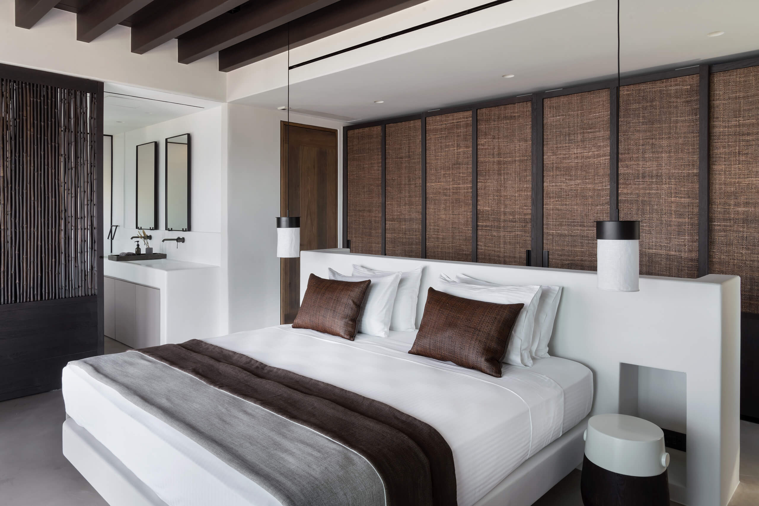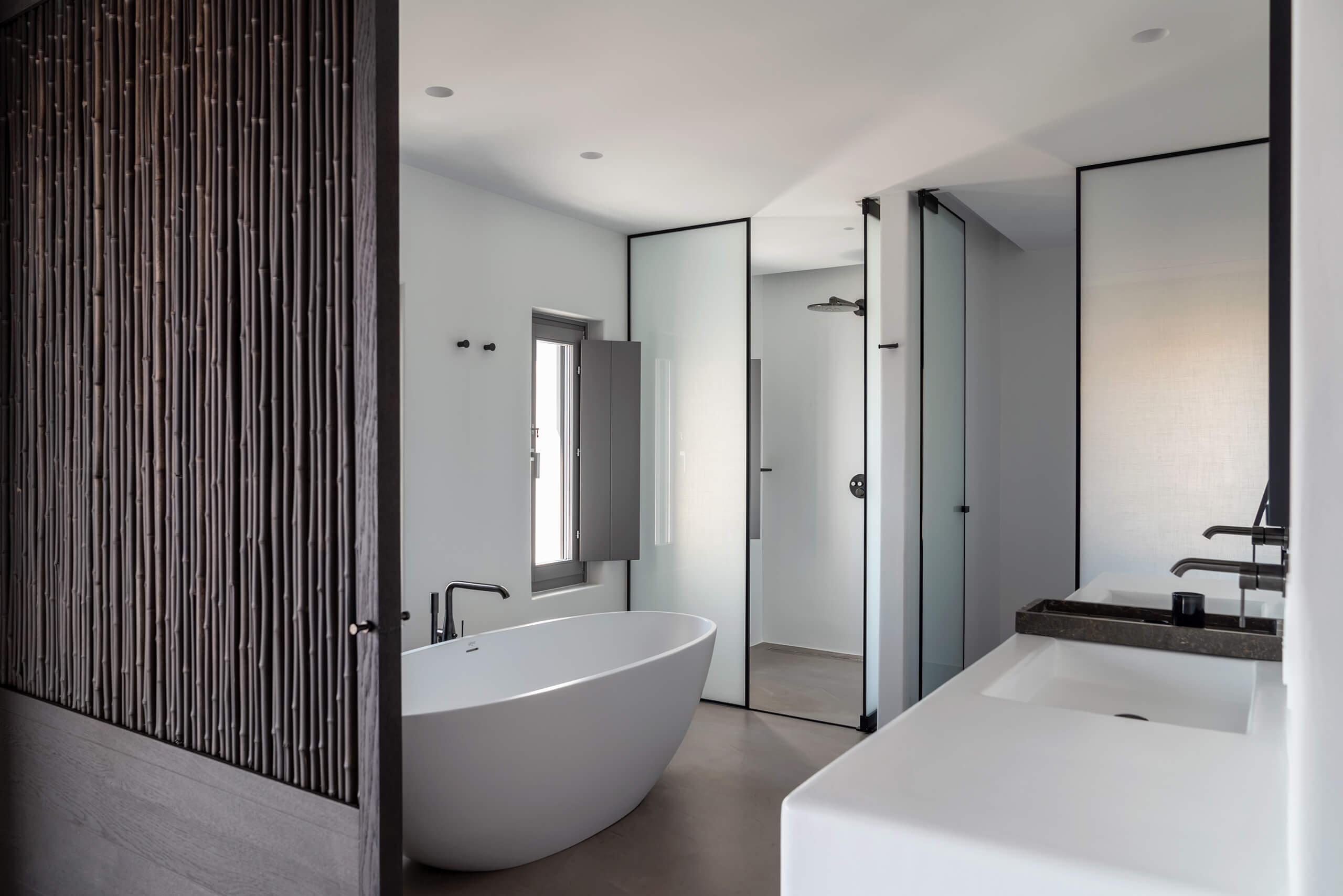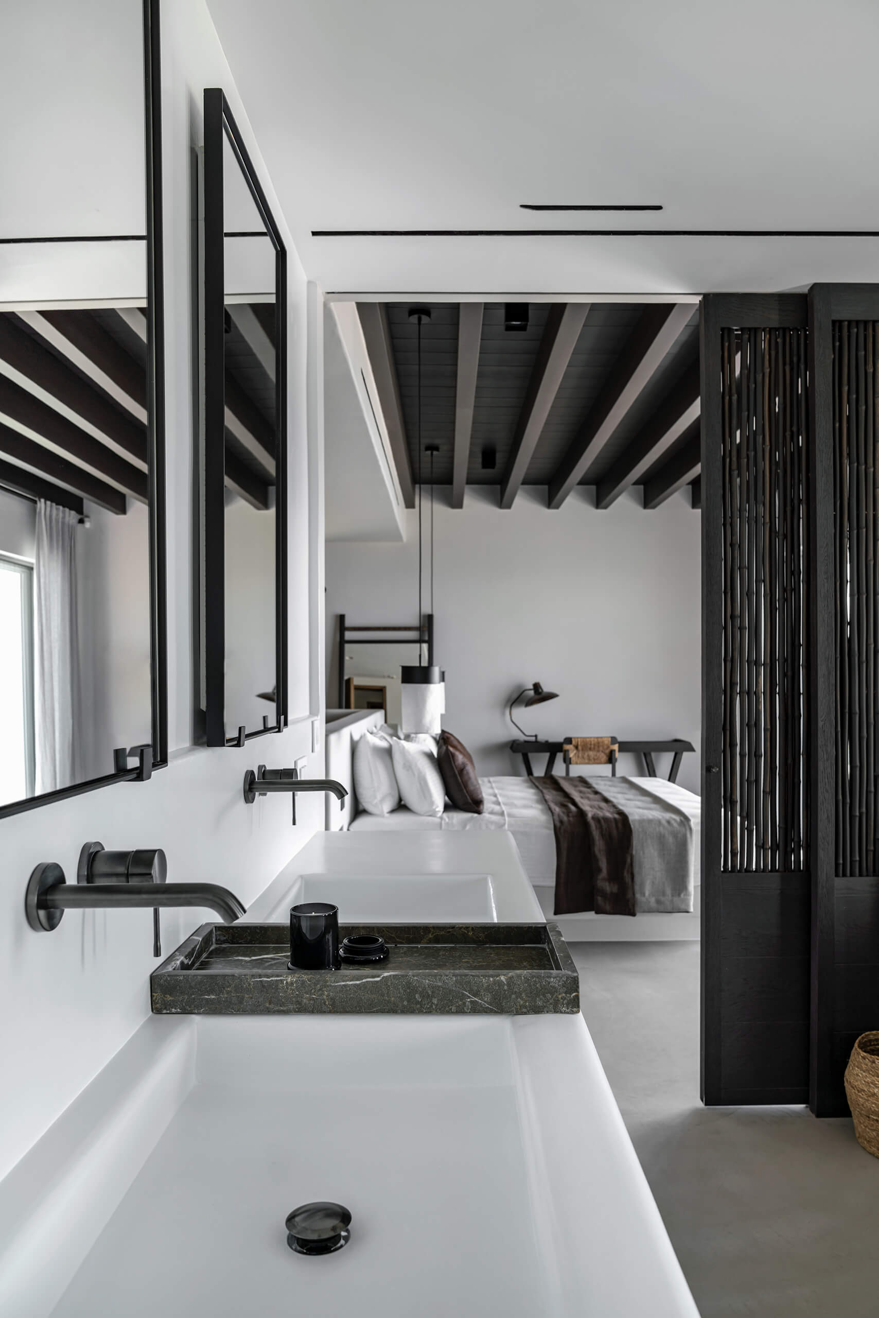 Suite 3: master bedroom with queen-size bed, TV, open plan en-suite bathroom with a bathtub -with direct sea view via a window-, direct access to a private balcony, panoramic sea view from the bed.