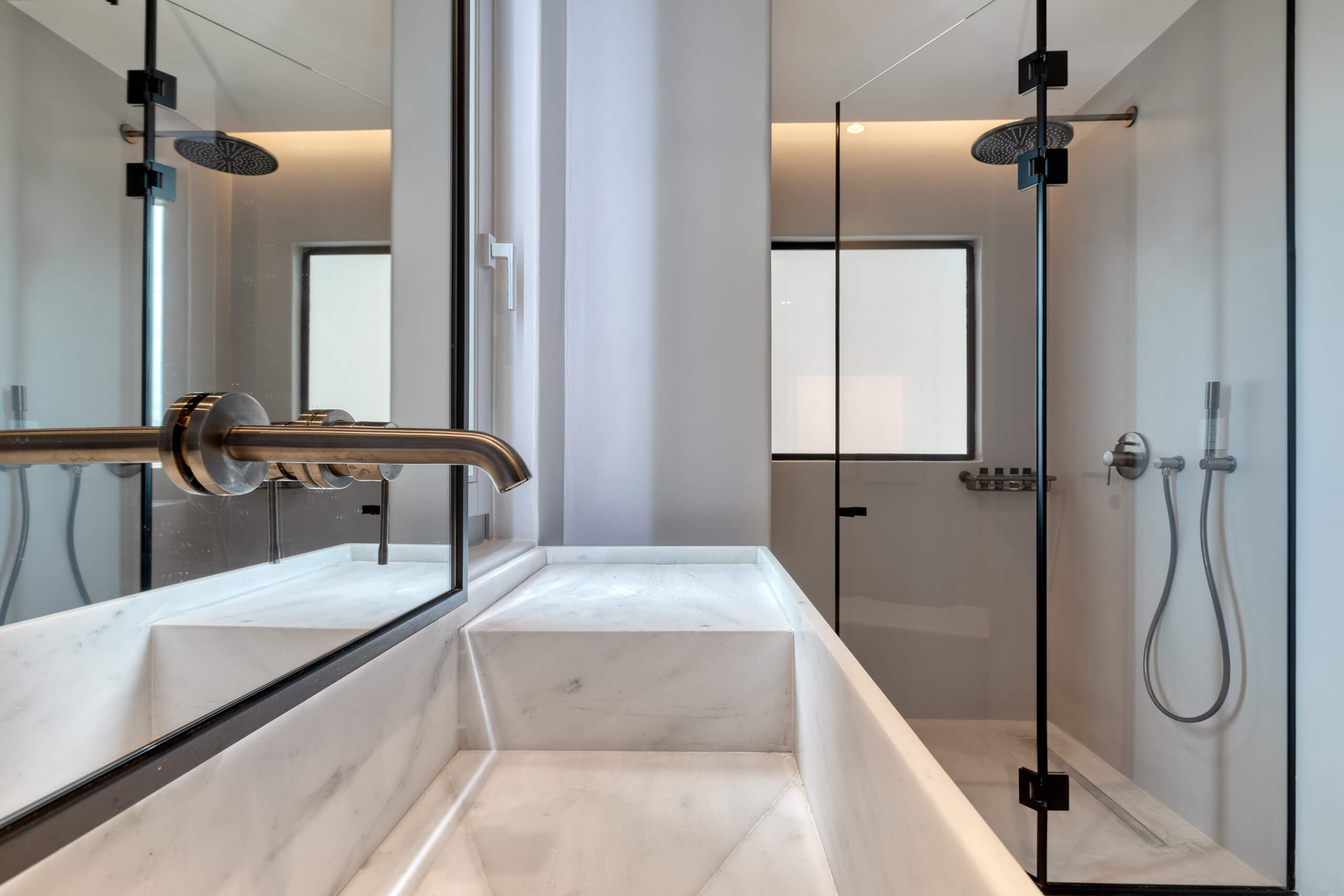 Suite 4: built-in queen-size bed, TV, en-suite bathroom with shower, access to an outdoor very well-designed hot shower, direct access to a terrace via balcony doors | panoramic sea view room | the room has access through the indoor living room area + an individual door.