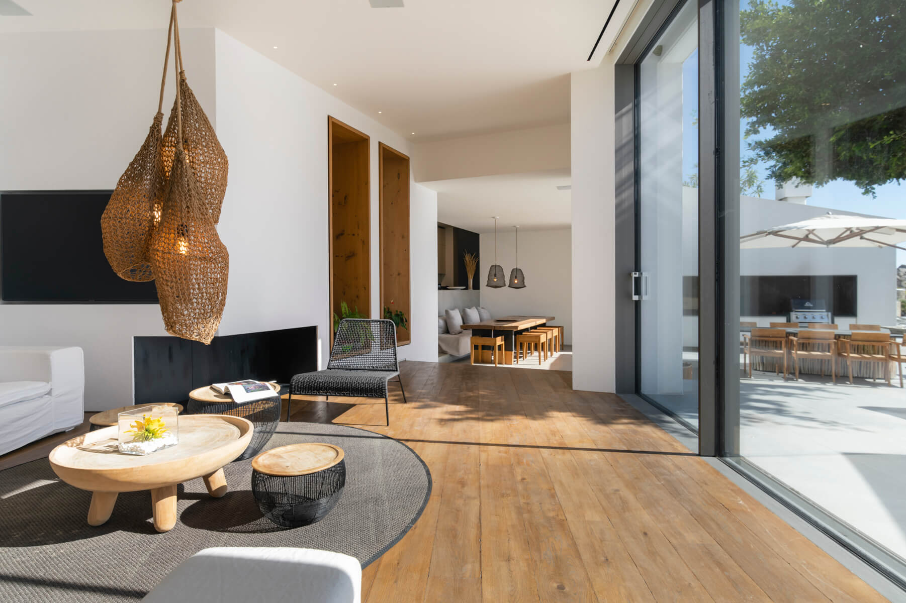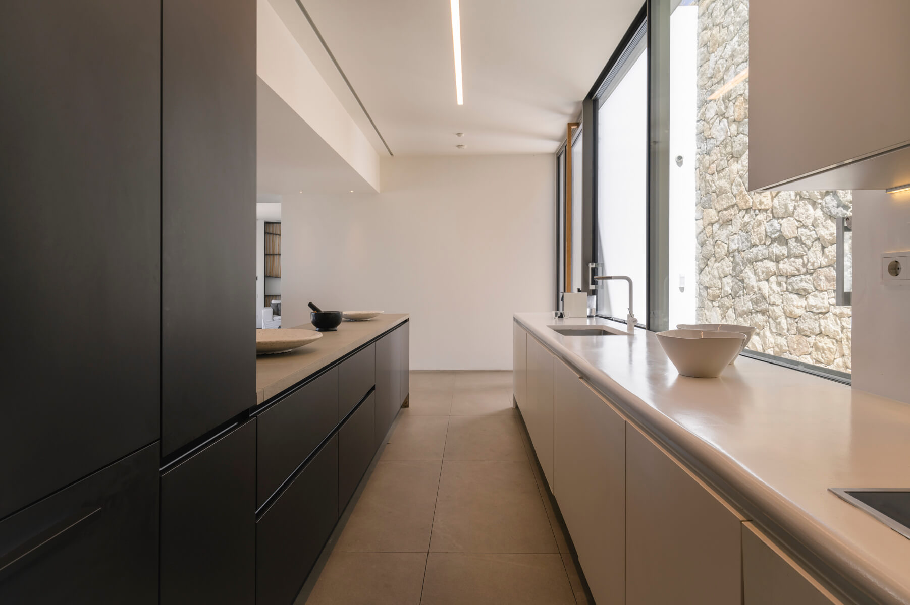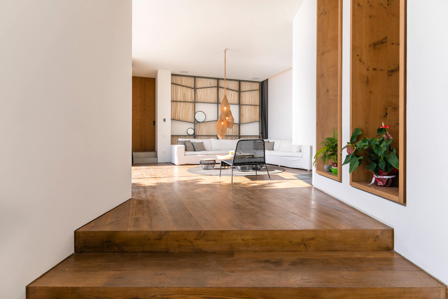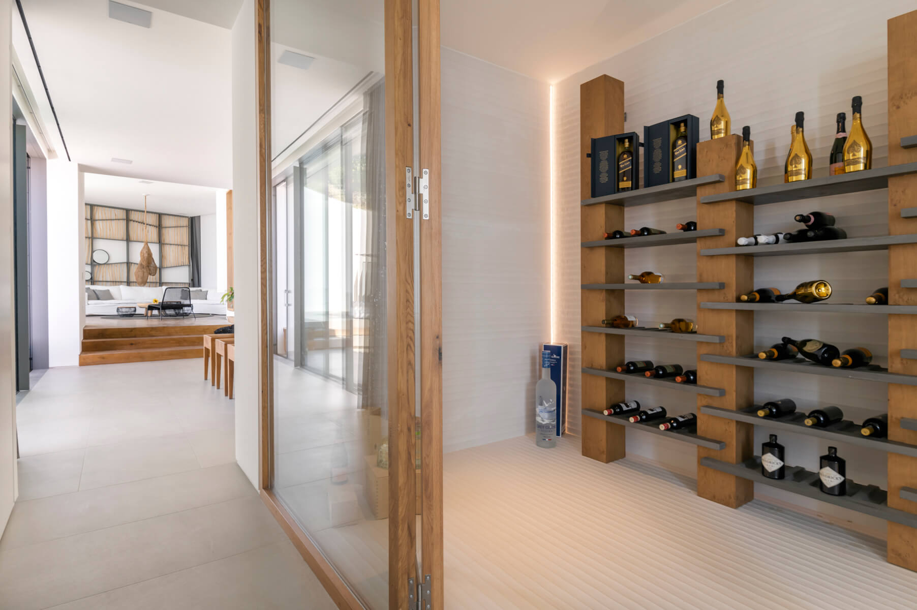 Entrance floor: open plan fully equipped kitchen with direct access to the outdoors, living room with TV, home theater, indoor dining area [10 seats], living room with built-in sofas, guest WC, wine room.