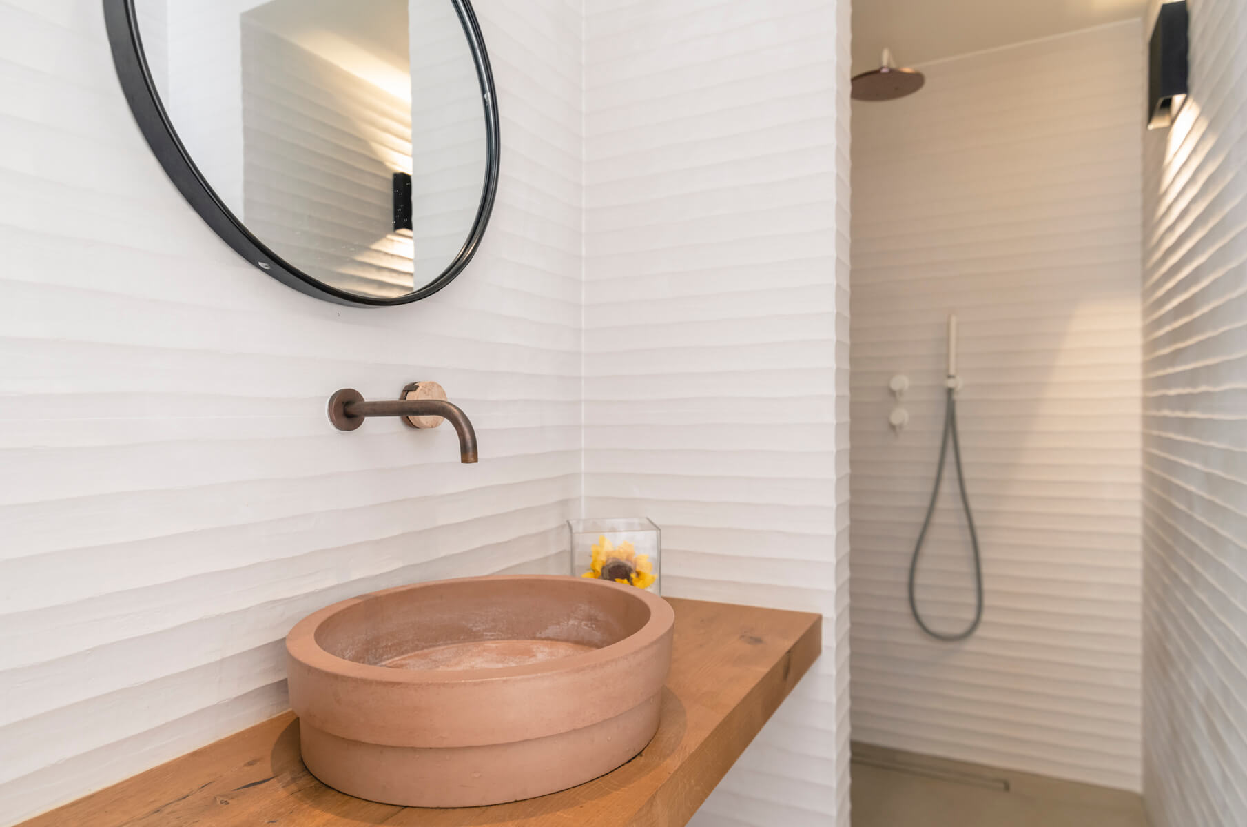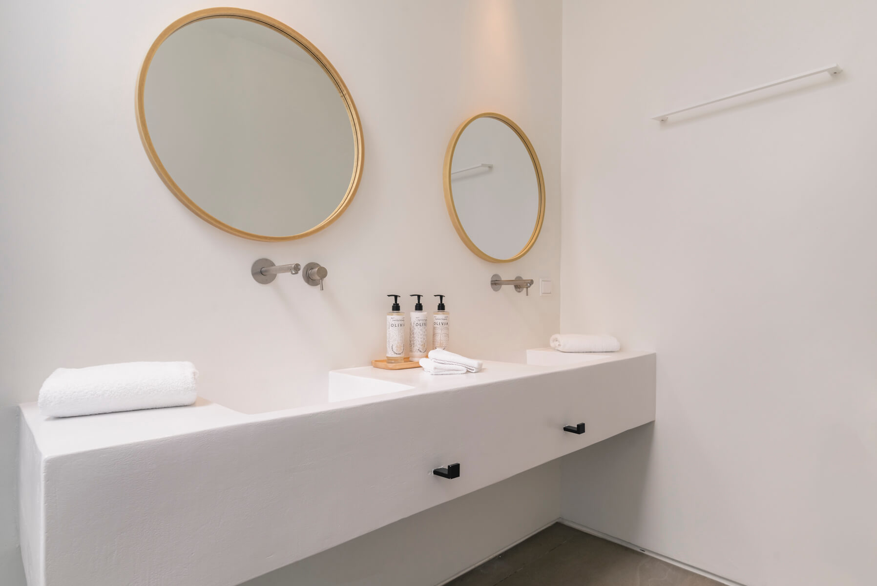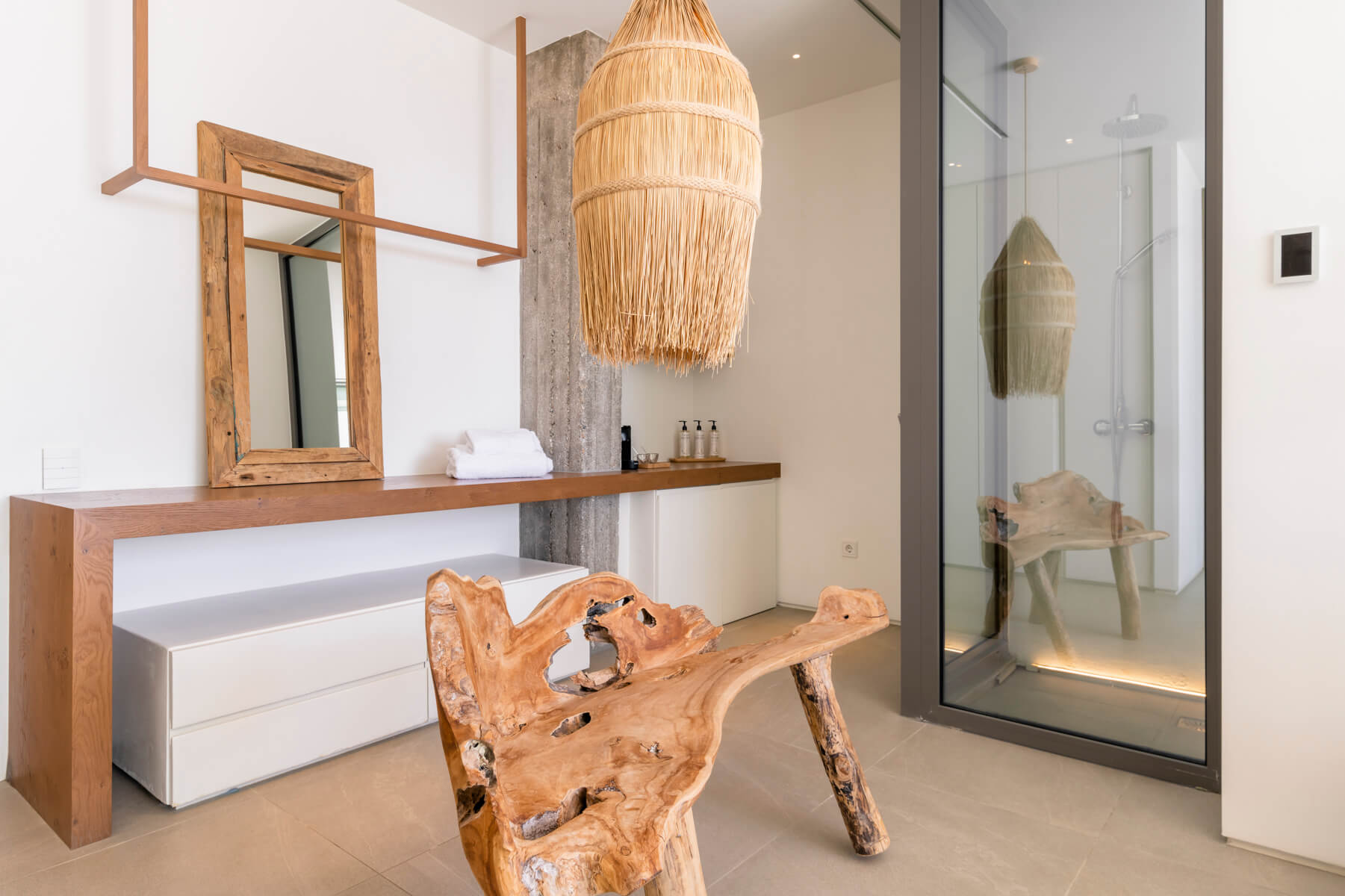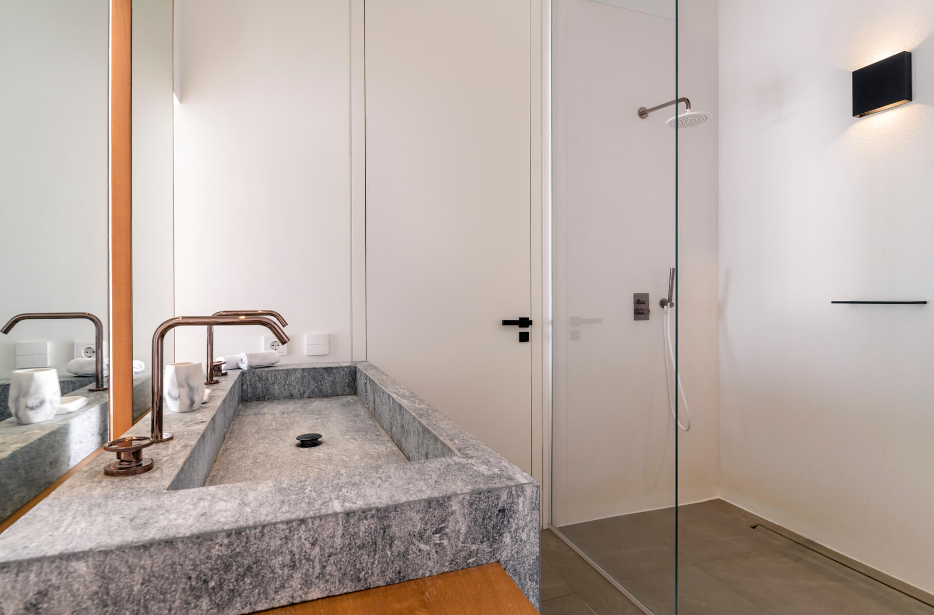 Room 3: double bed, TV, safebox, [A/C], and ensuite bathroom with shower | access to the pool area via balcony doors – sea view room. Fully equipped gym with sea view and ensuite bathroom with shower
