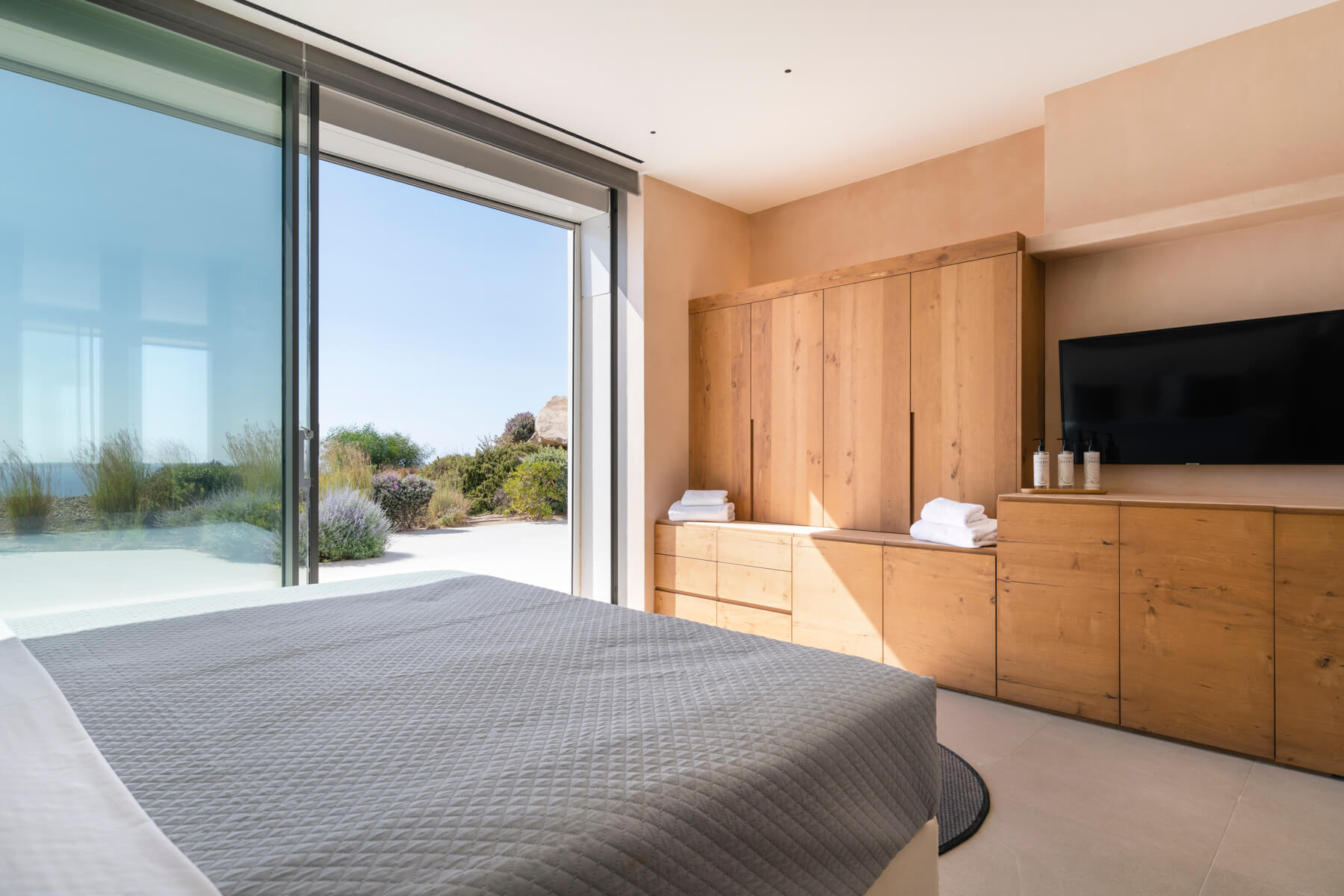 Room 4: double bed, TV, safebox, [A/C], and ensuite bathroom with shower | access to the pool area via balcony doors – sea view room.