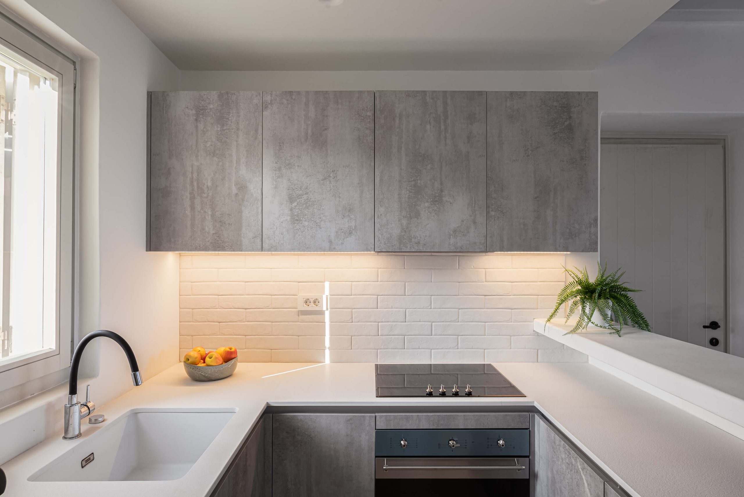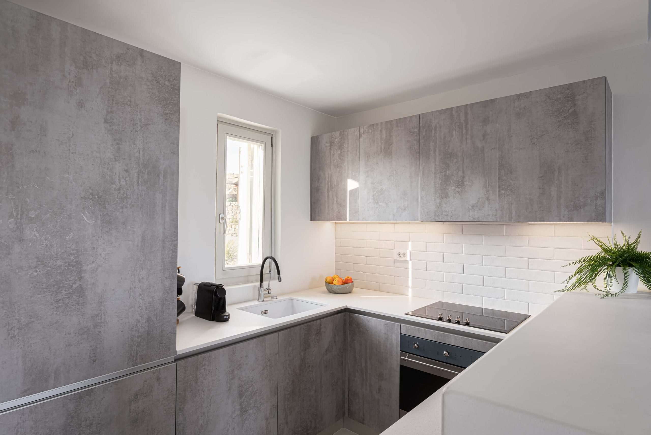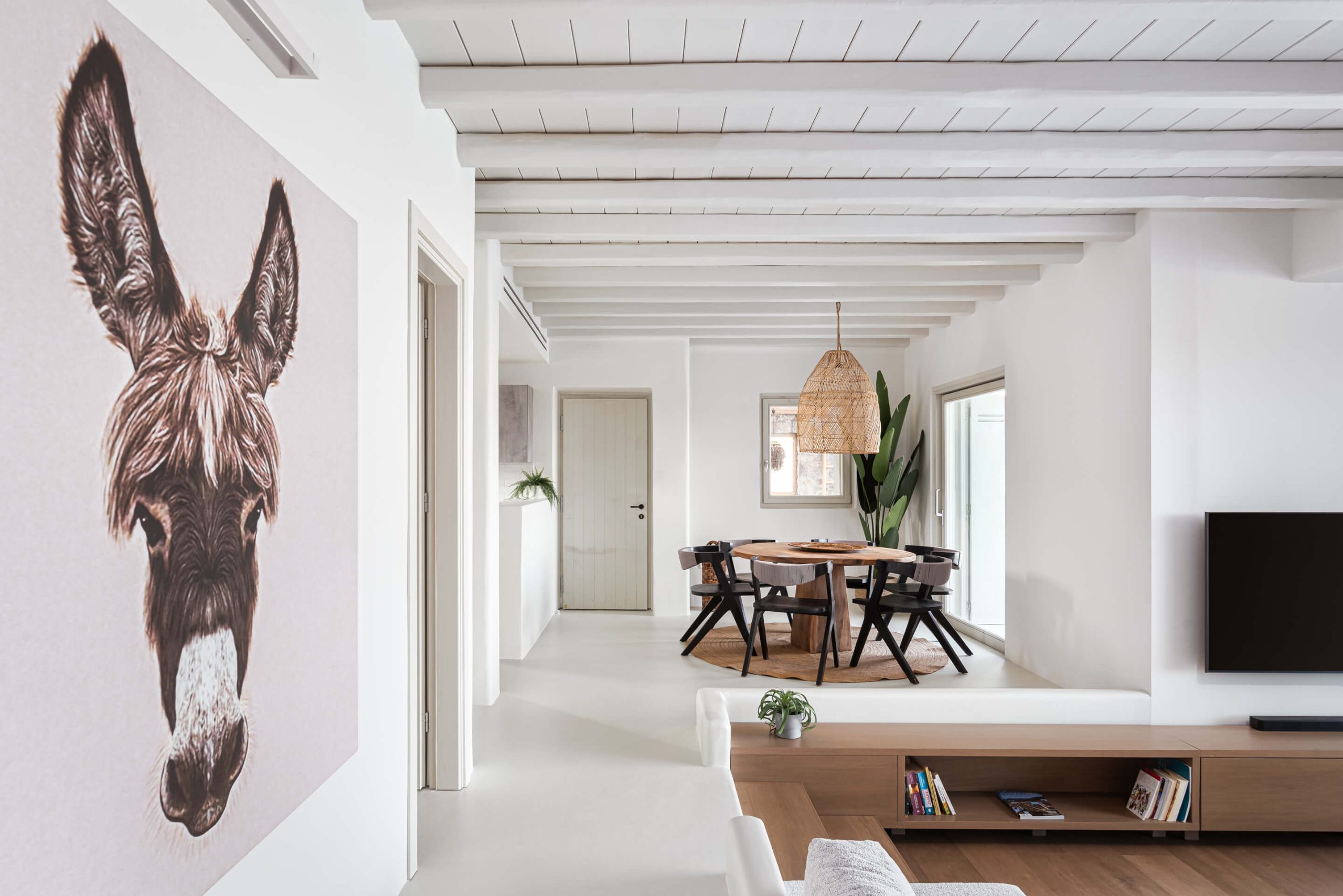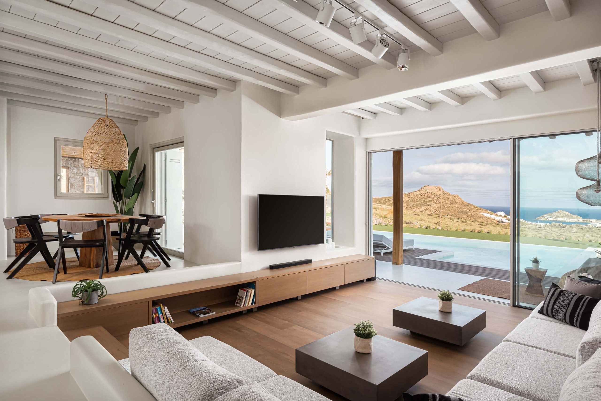 Open plan fully equipped kitchen, spacious living room with TV, pool and sea view, indoor