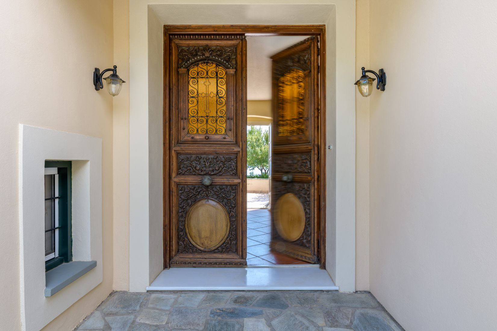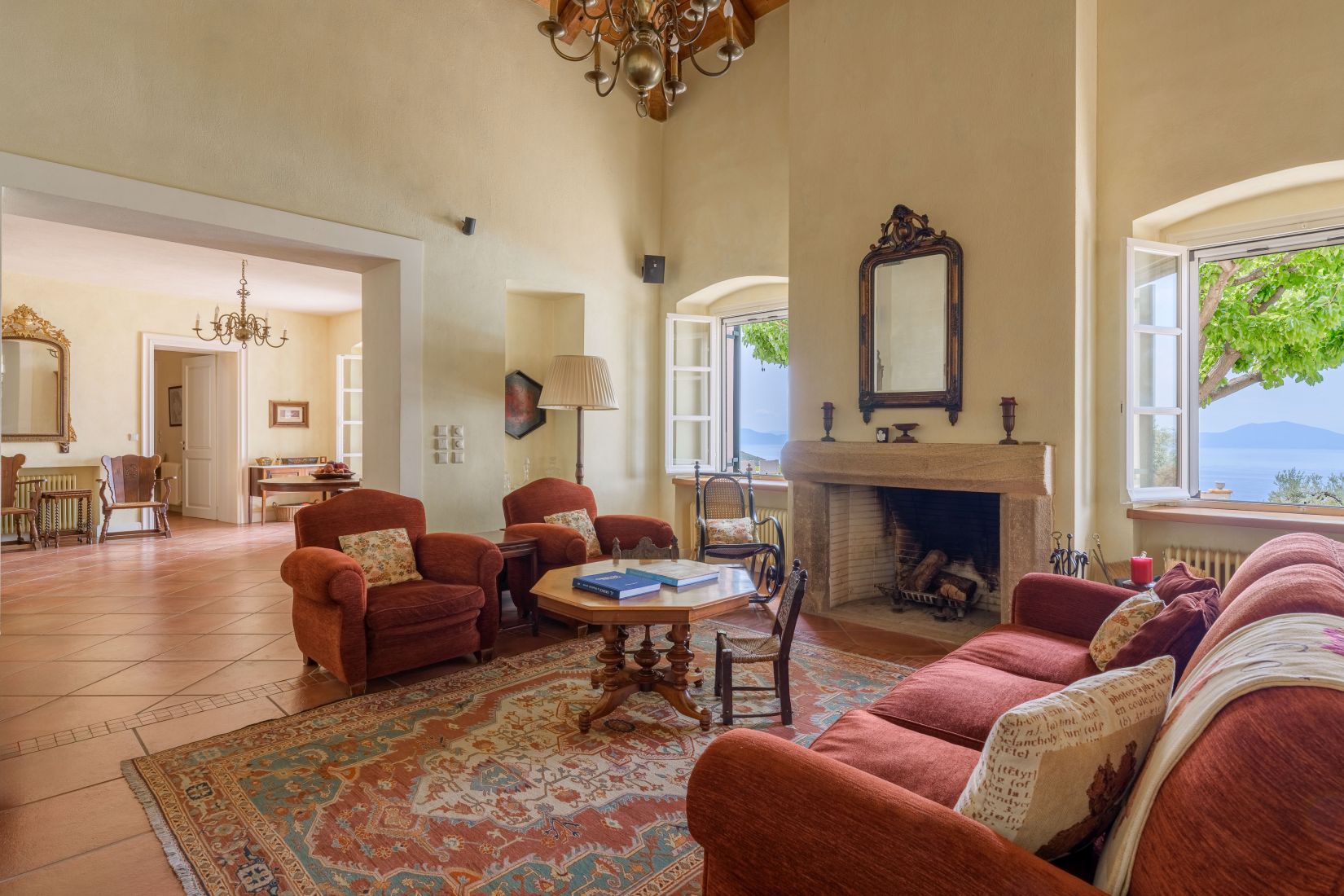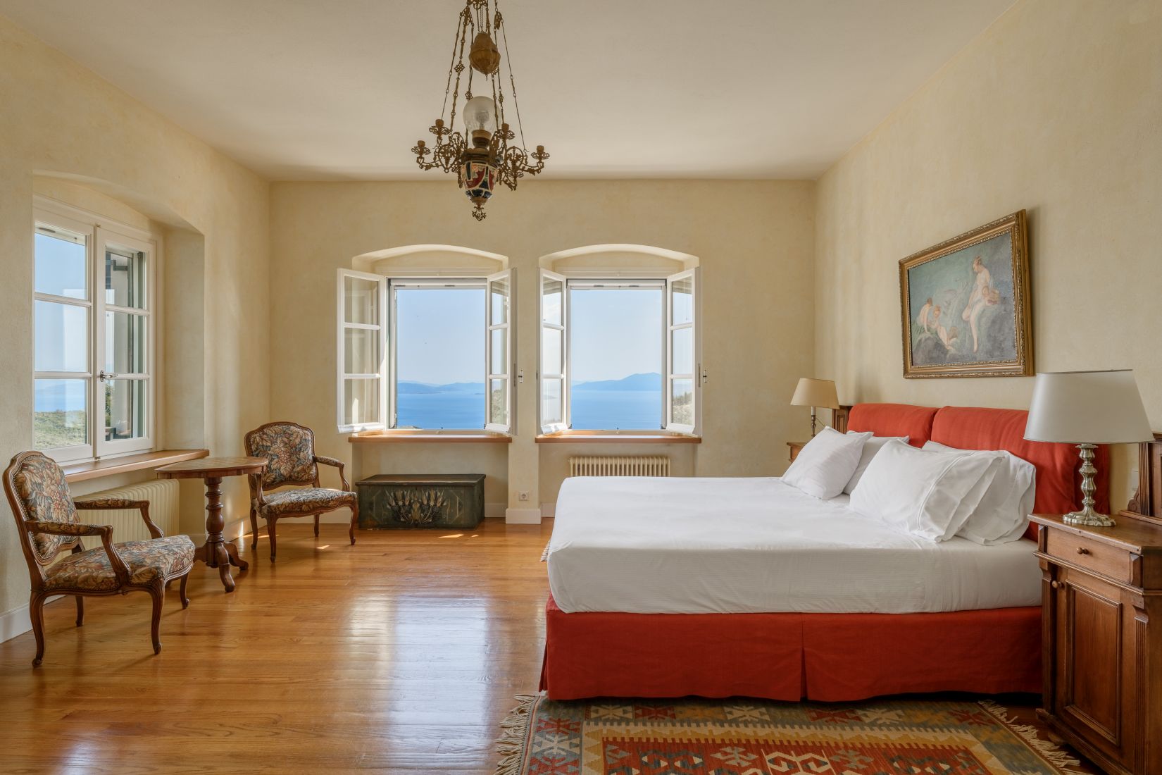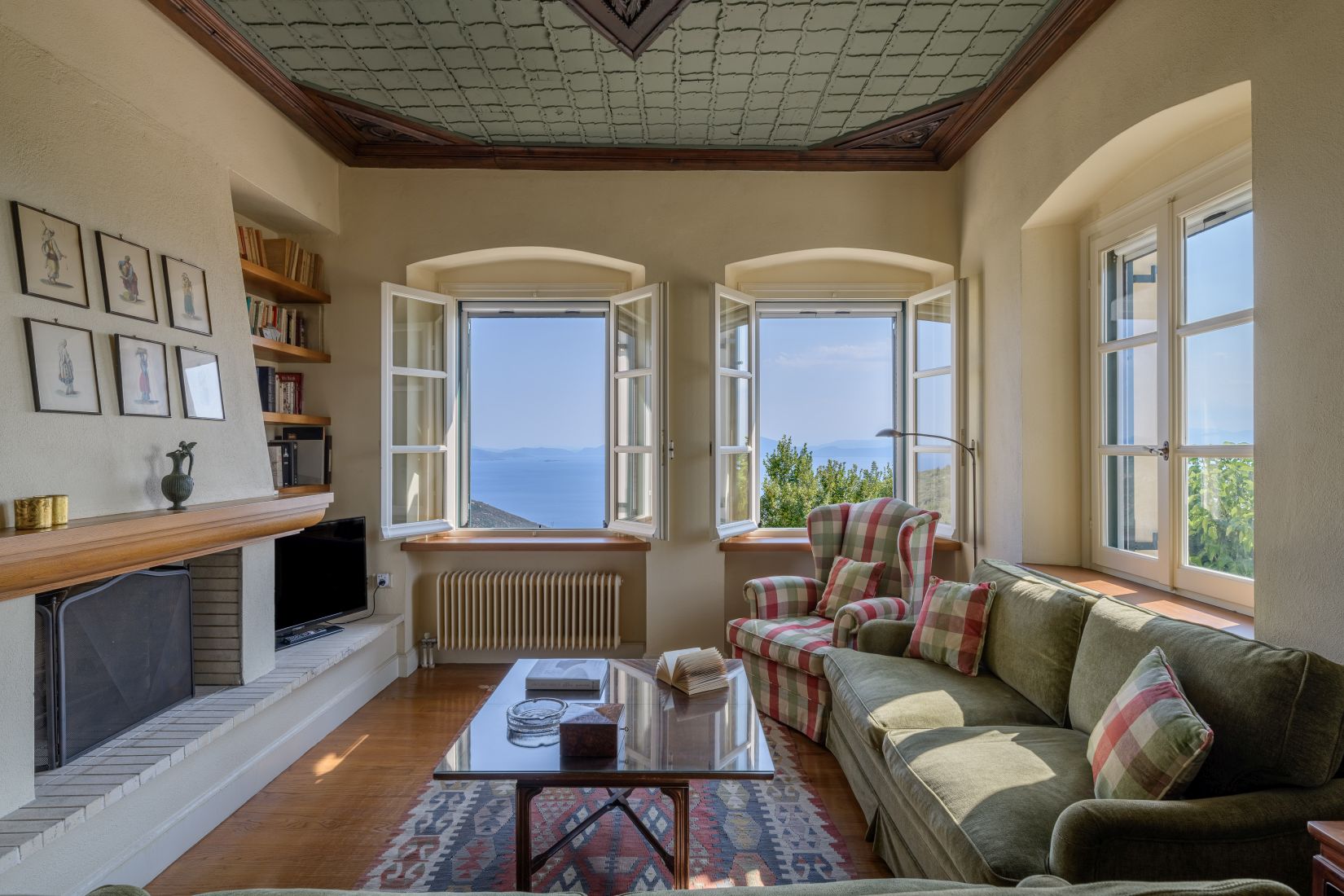 The villa’s design is inspired by Tuscan architecture, featuring antique wooden doors, hand-crafted ceilings, a grand stone fireplace, and traditional terracotta floors. Large picture windows in the living areas flood the interiors with natural light and frame breathtaking views of the Pagasetic Gulf.