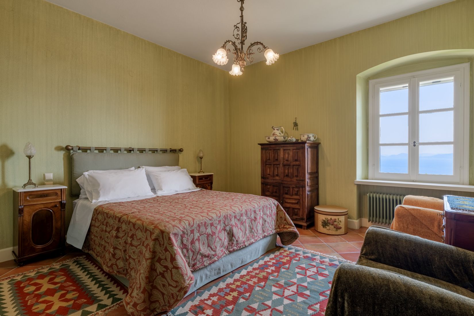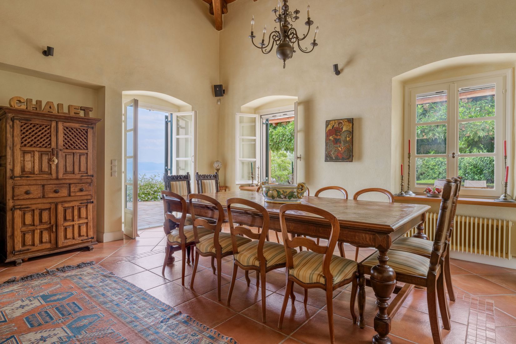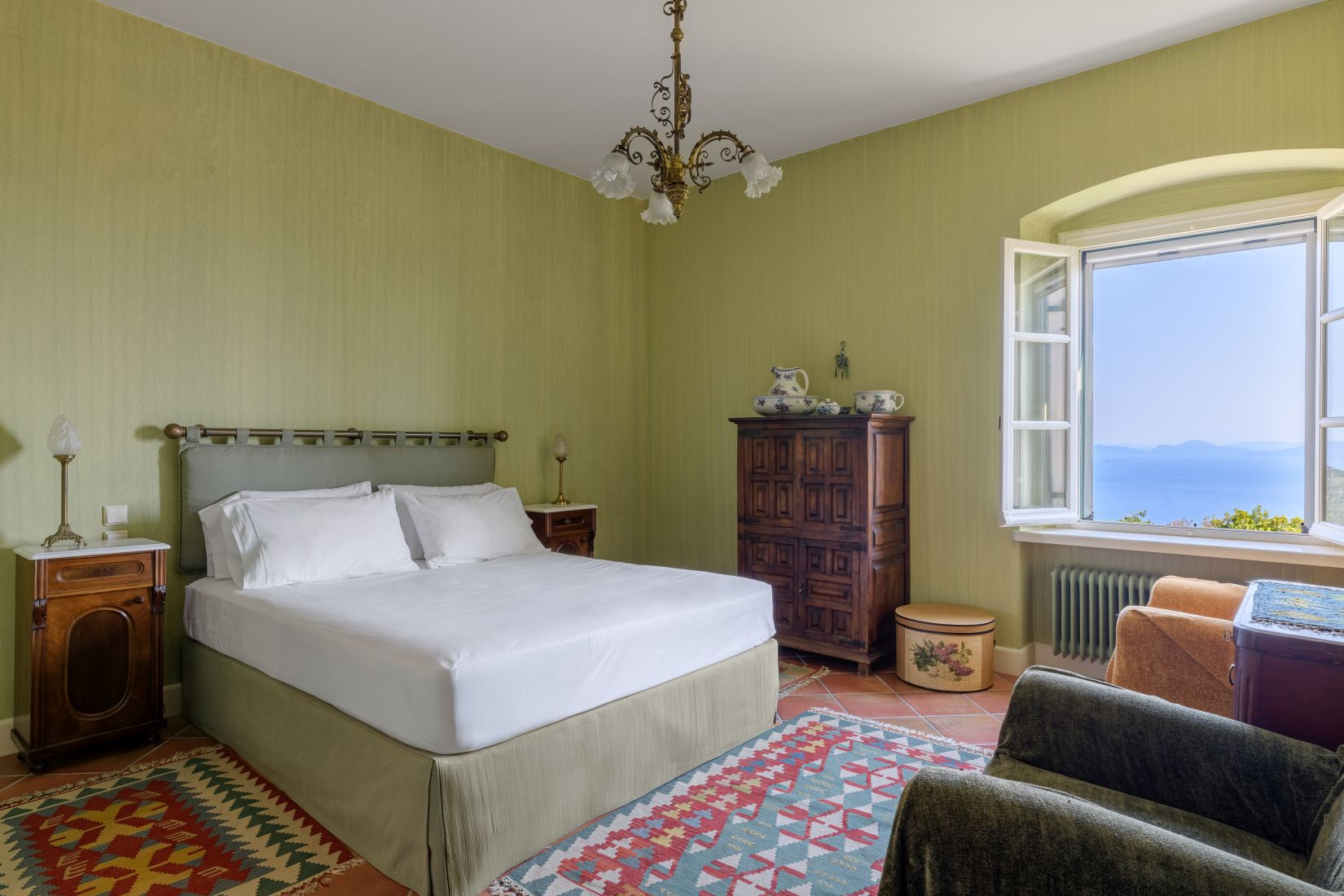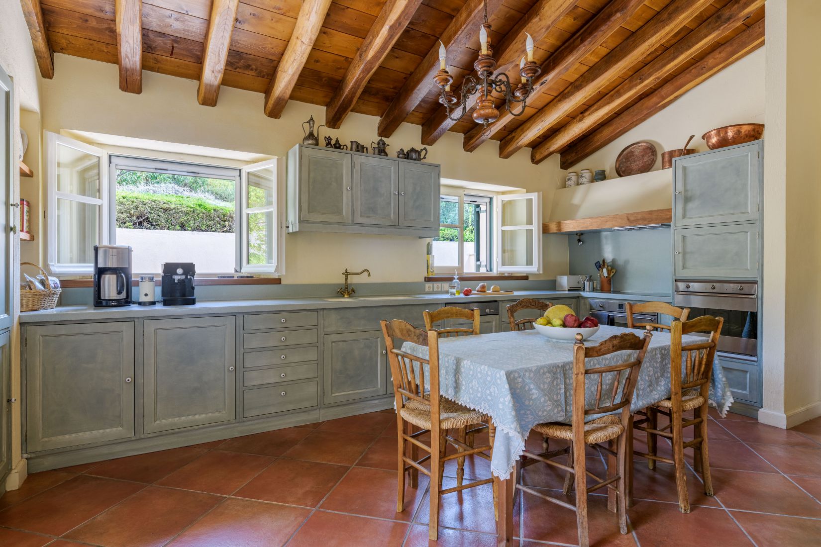 The villa’s design is inspired by Tuscan architecture, featuring antique wooden doors, hand-crafted ceilings, a grand stone fireplace, and traditional terracotta floors. Large picture windows in the living areas flood the interiors with natural light and frame breathtaking views of the Pagasetic Gulf.