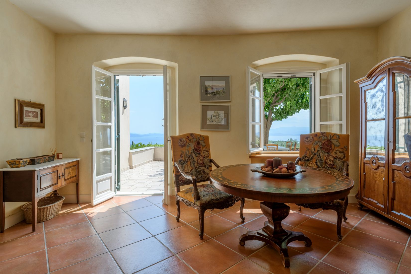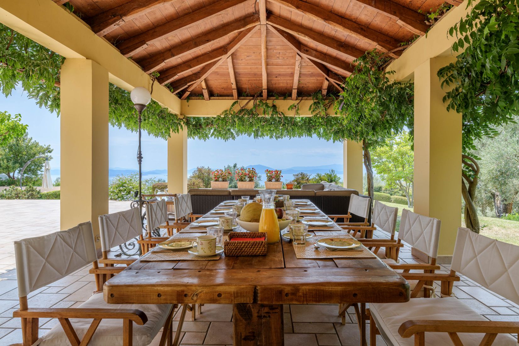 A large pergola shaded with wisteria shelters a beautiful dining table for 12 guests — perfect for leisurely lunches or candlelit dinners overlooking the sea. Two centuries-old mulberry trees on the terrace provide shade and a peaceful spot for sunset cocktails.