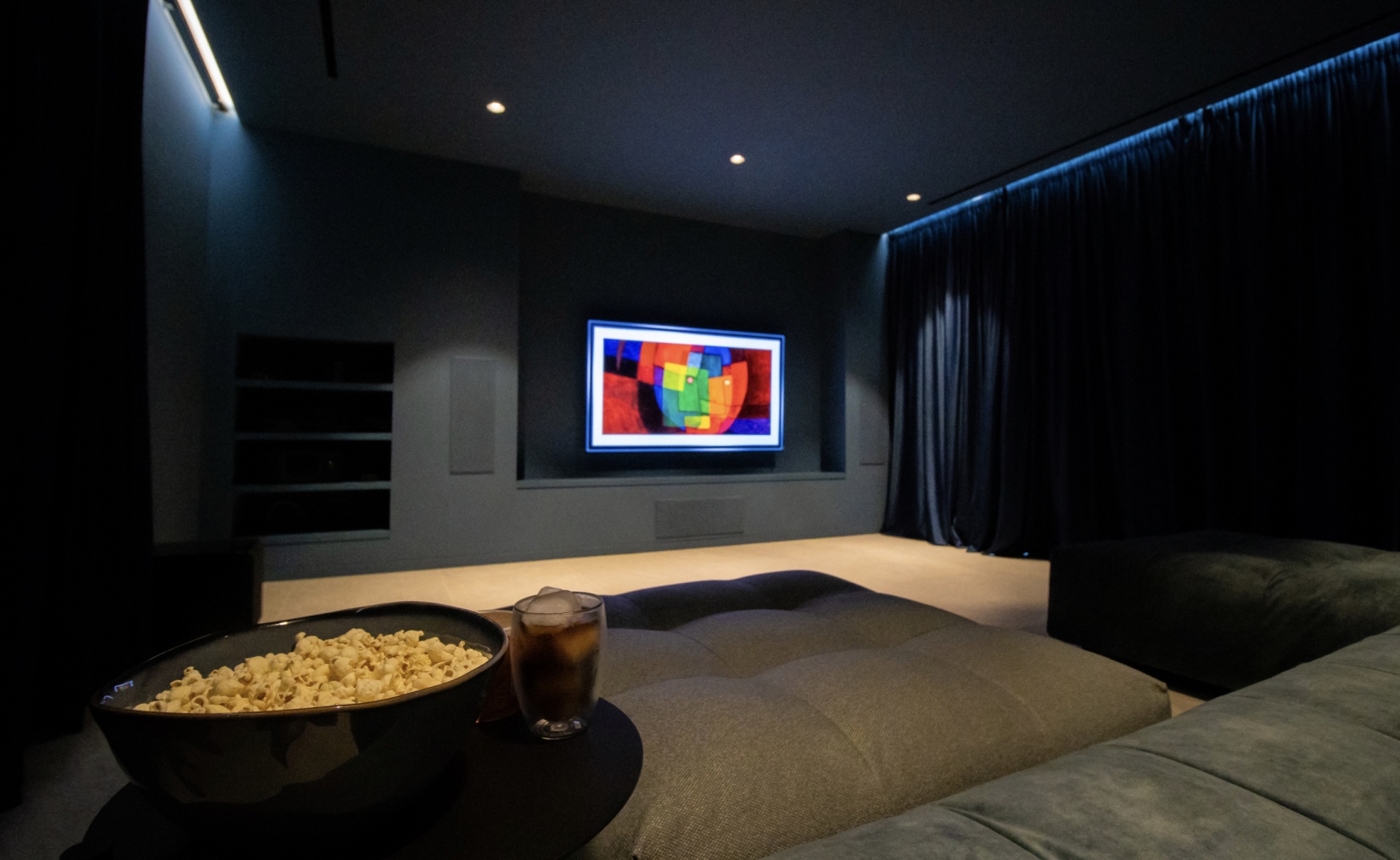 On the Lower level, there is a cinema room with a modular sofa fully equipped with a large screen and a high end audio video system and a laundry room.