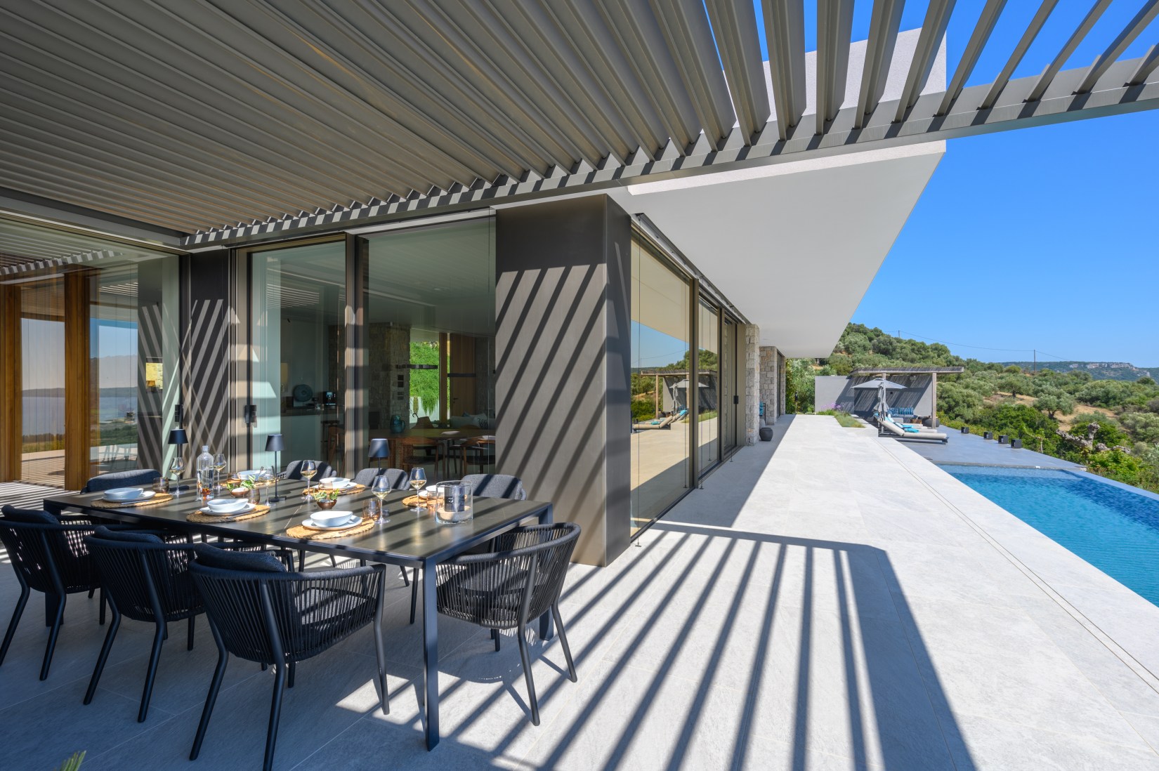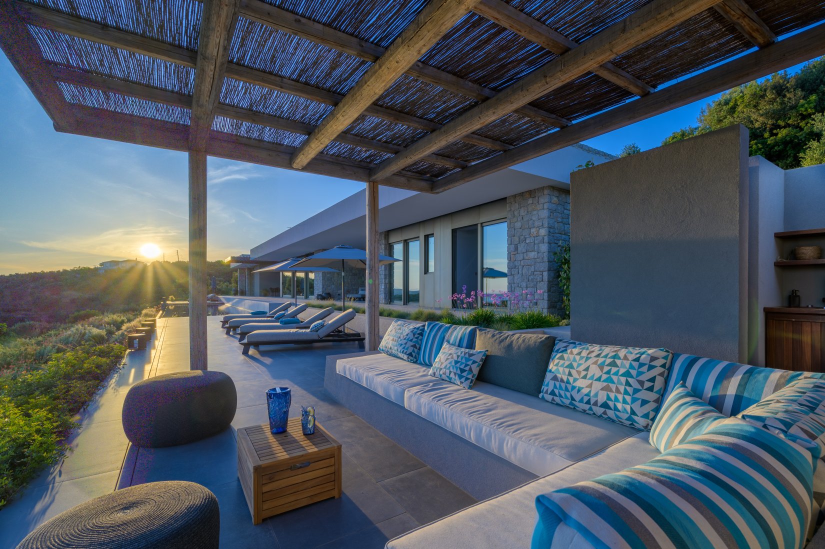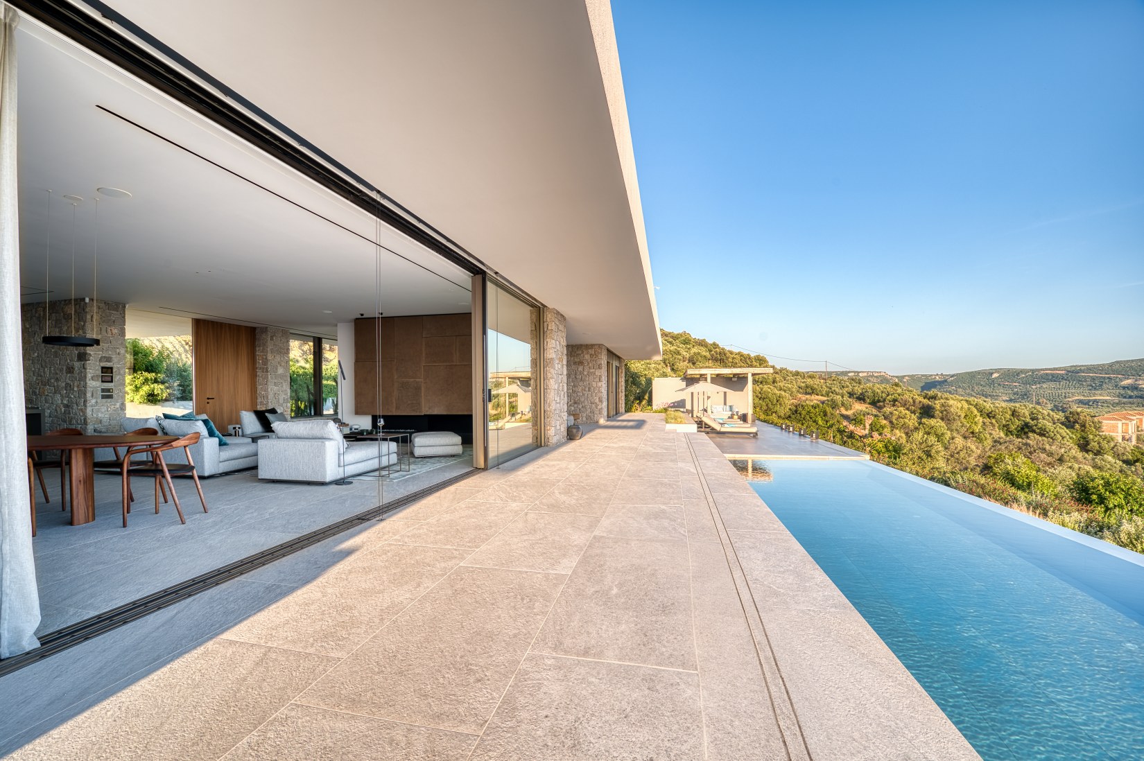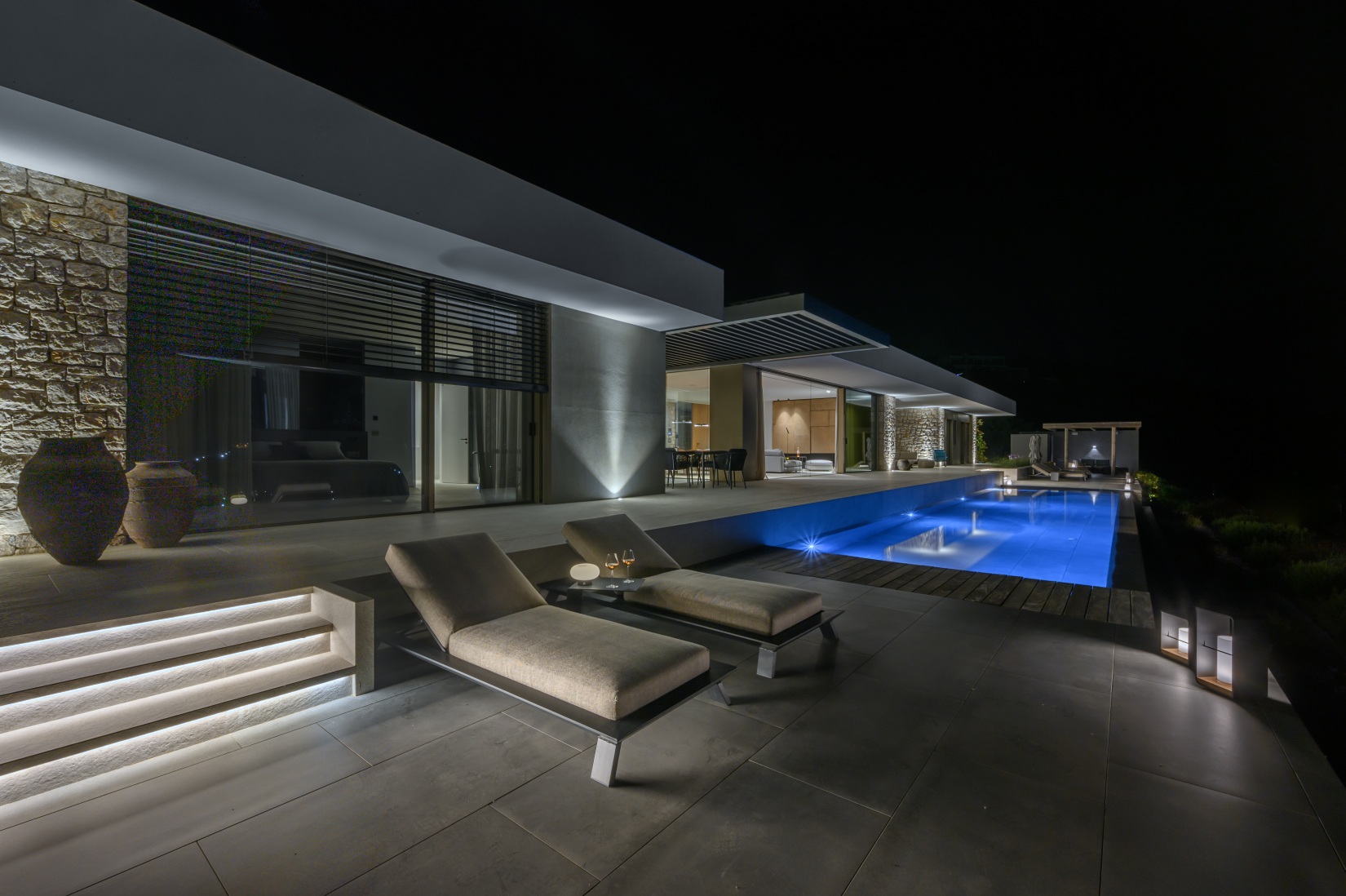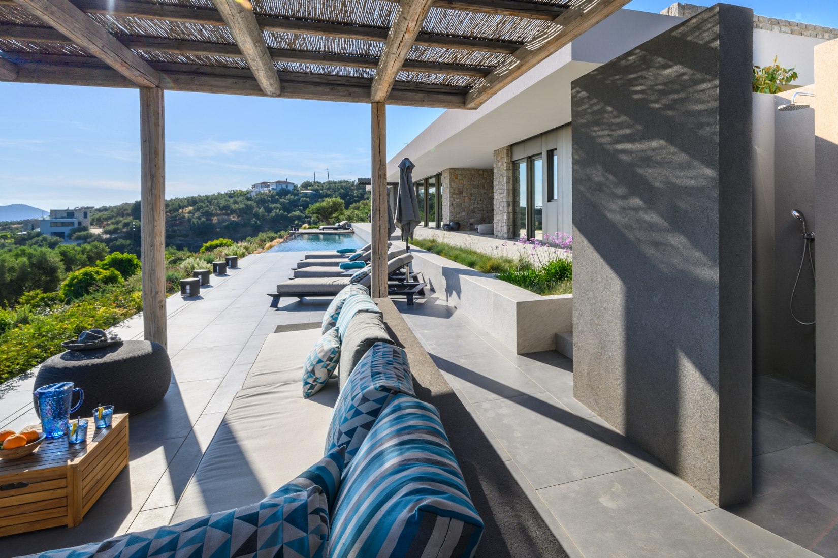 The outdoor area with wonderful endless sea view, the daily sparkling light all over the place and at the same time the shady corners including lounge area, an exterior dining space will give the opportunity at the guests to enjoy the amazing landscape and create unforgettable moments. The infinity large swimming pool with relaxing areas is definitely a hot stop during the stay.