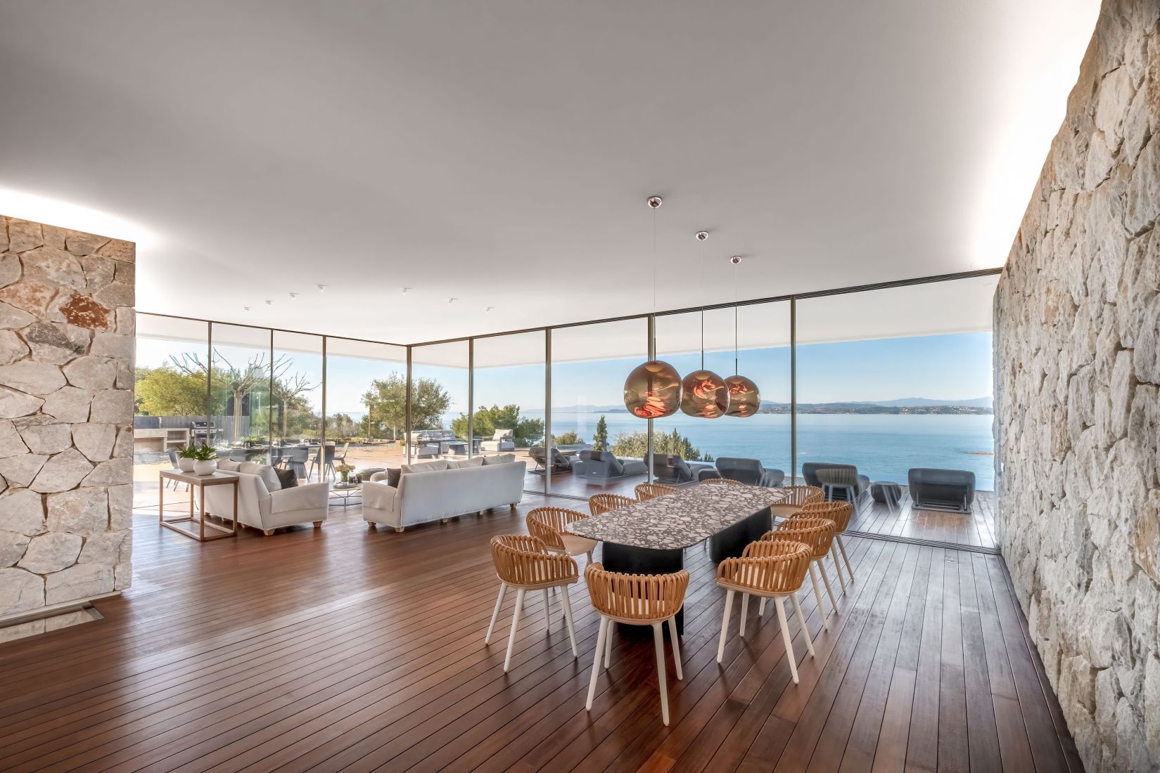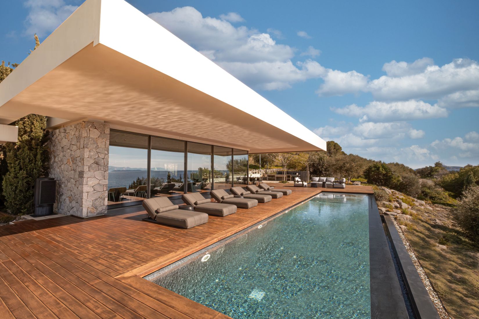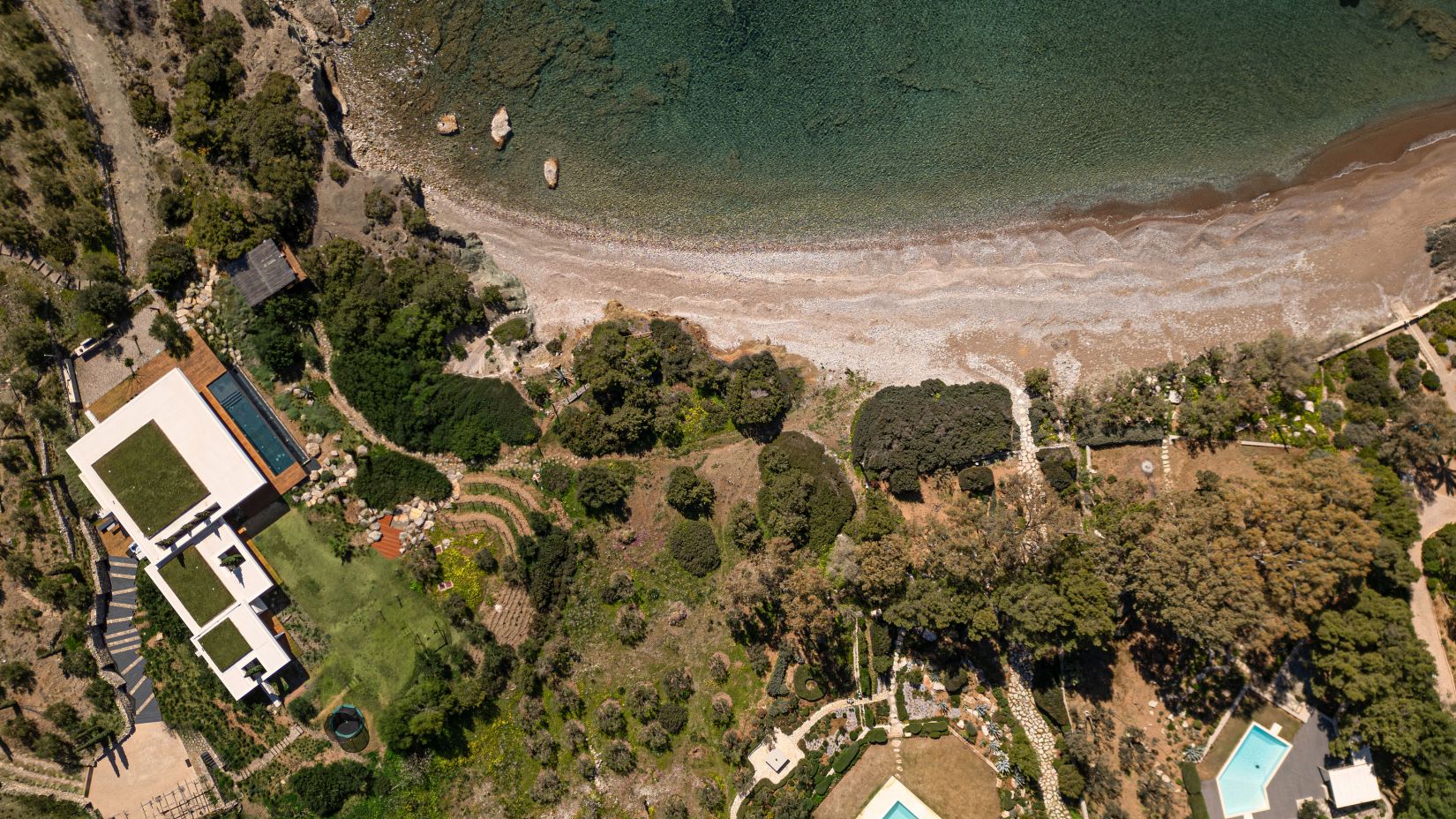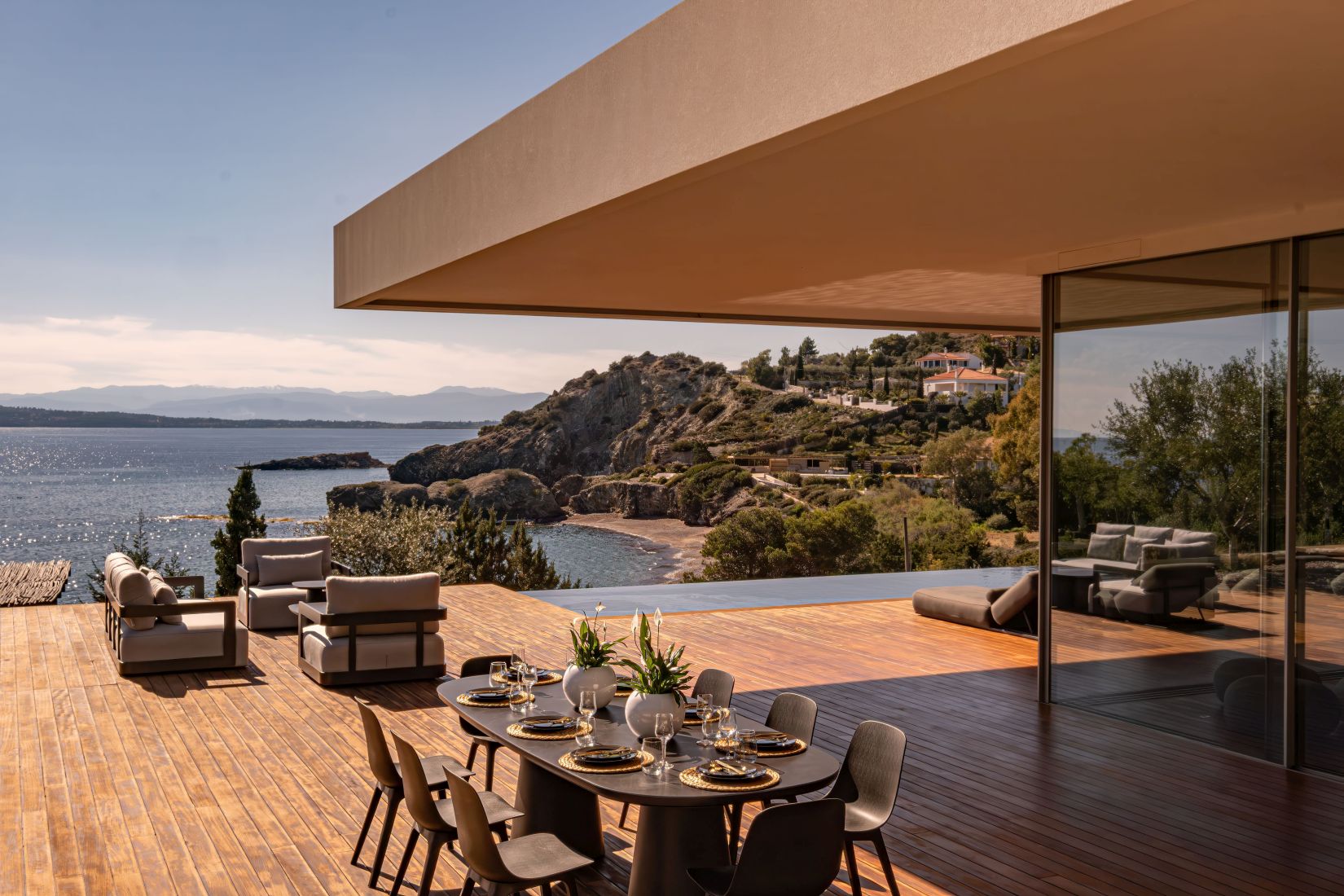 Open-plan living spaces flow seamlessly to the terraces outdoors, where the infinity pool appears to slip into the Aegean. Multiple lounging corners, shaded dining areas, and landscaped pathways leading to the private beach access encourage barefoot living and long afternoons under the Greek sun.