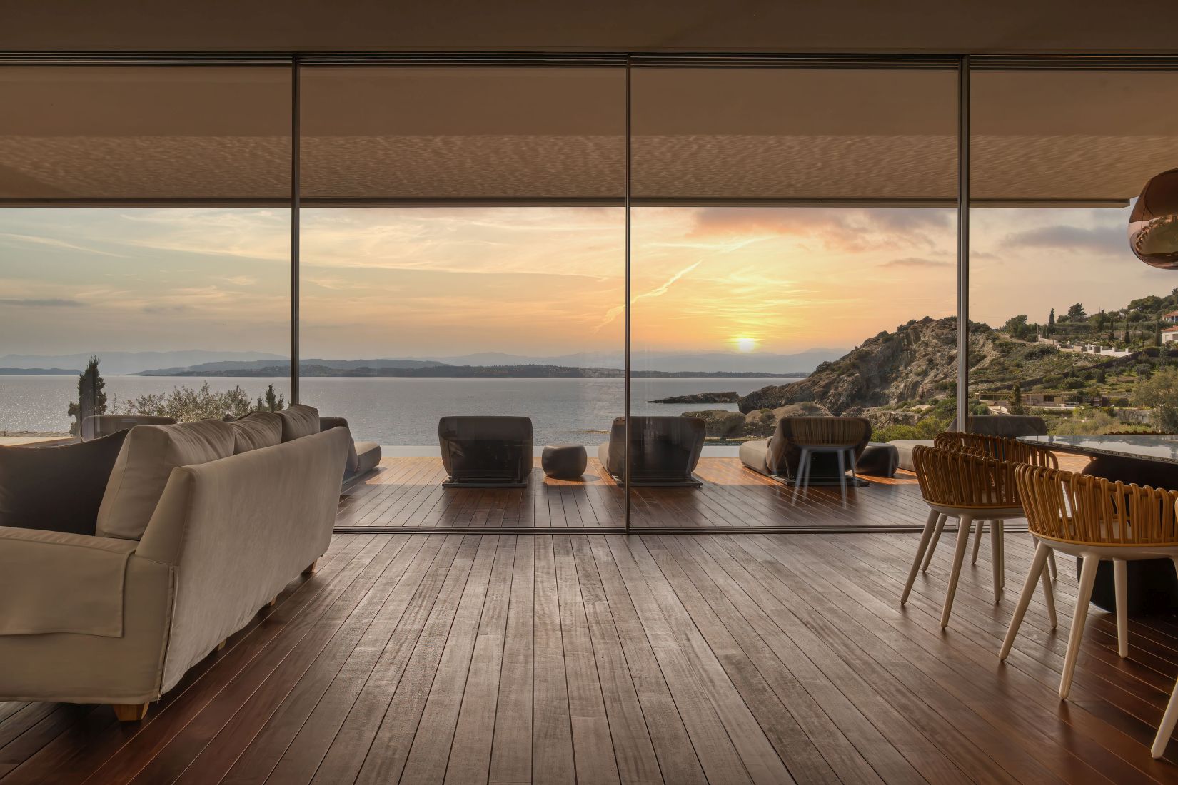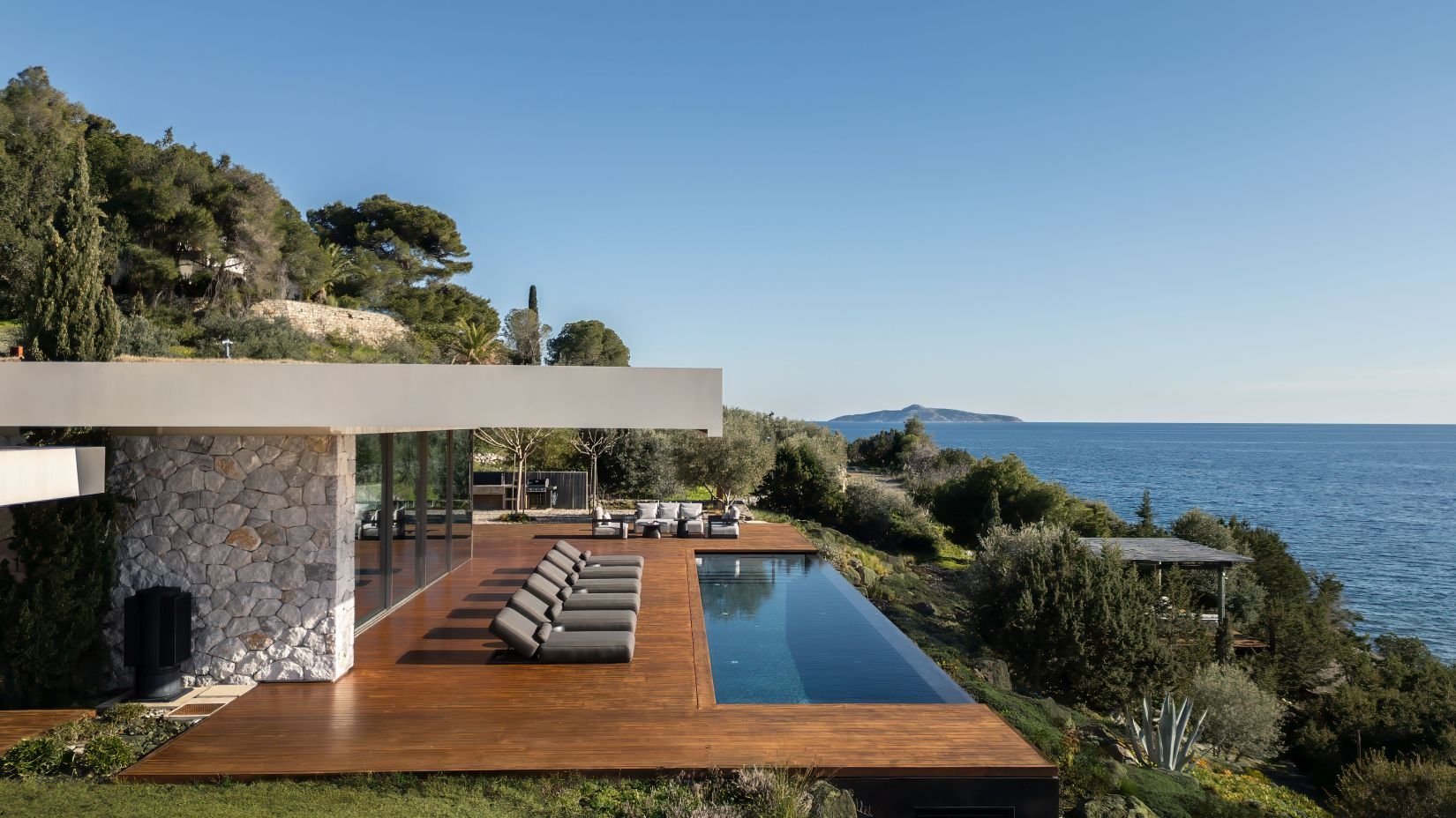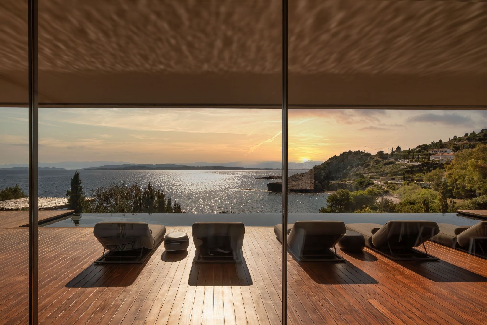 Open-plan living spaces flow seamlessly to the terraces outdoors, where the infinity pool appears to slip into the Aegean. Multiple lounging corners, shaded dining areas, and landscaped pathways leading to the private beach access encourage barefoot living and long afternoons under the Greek sun.
