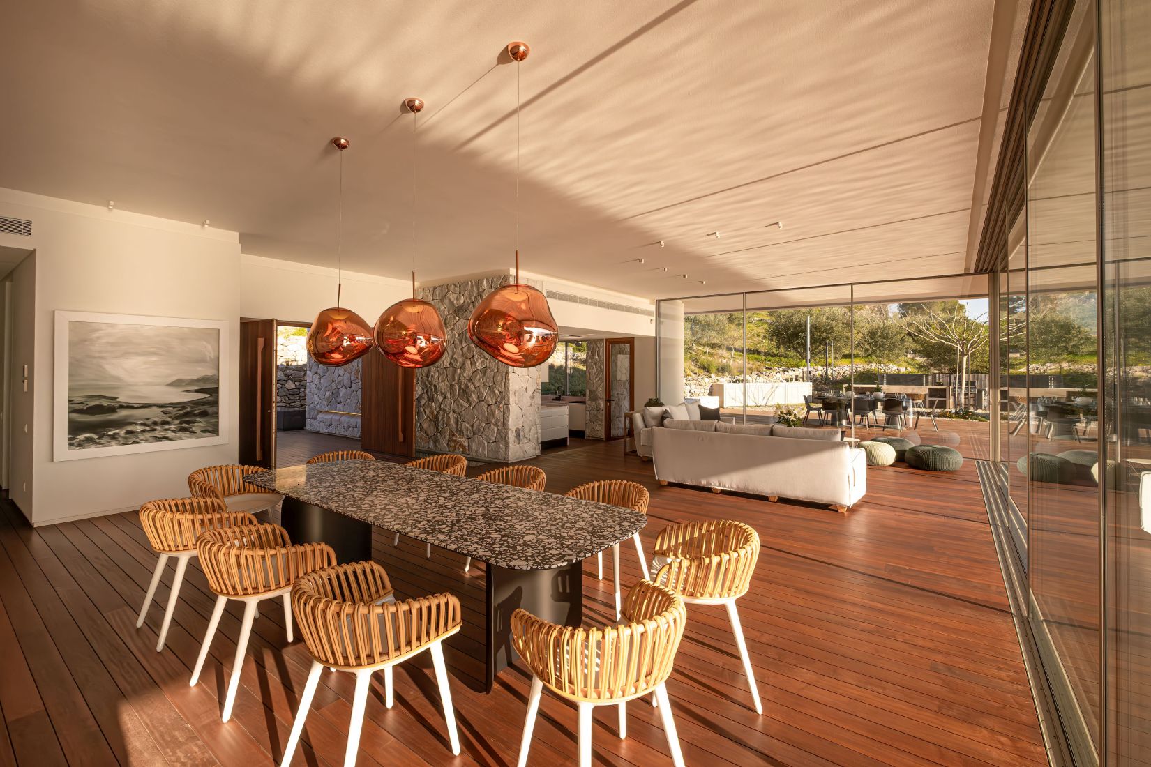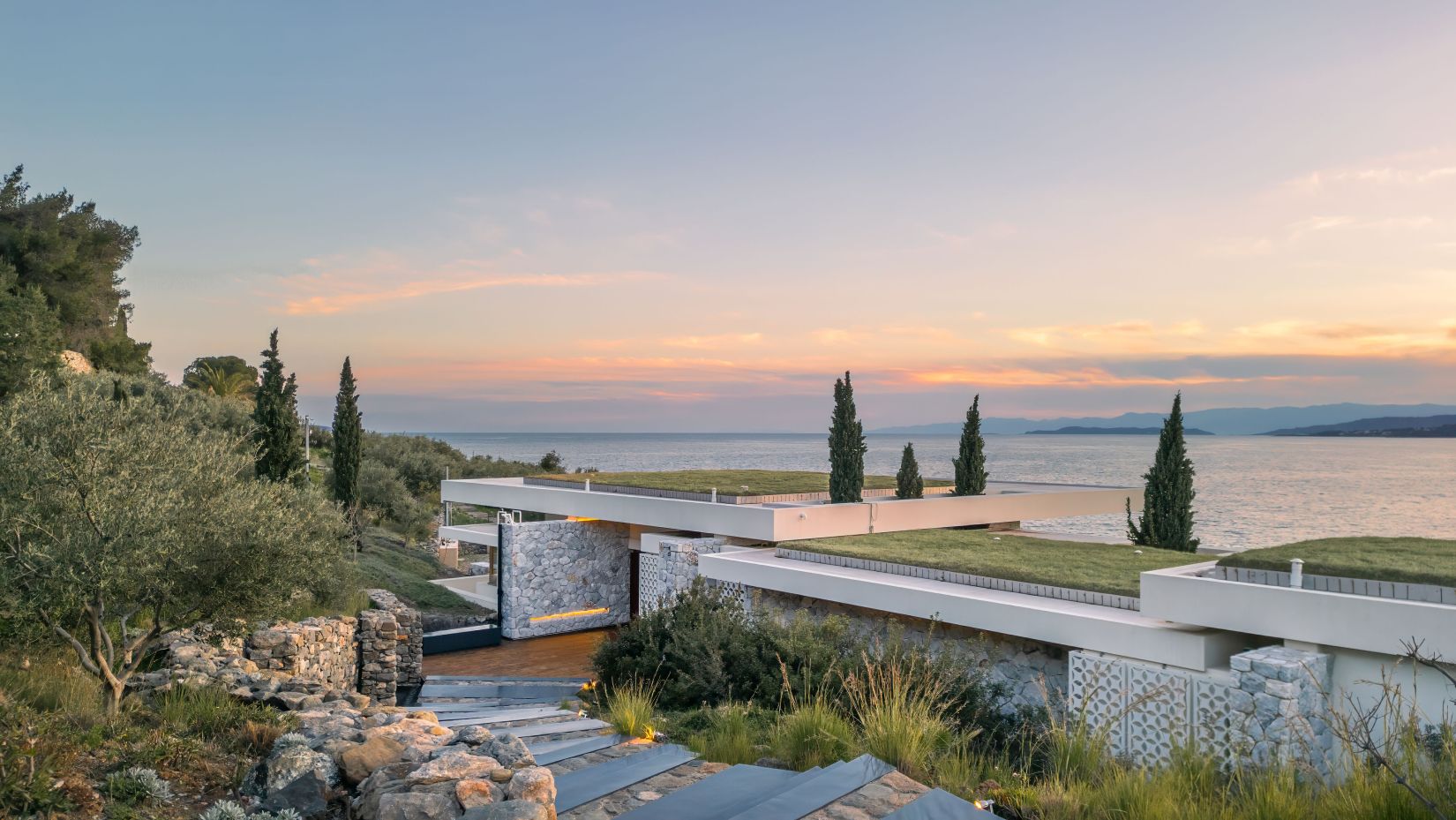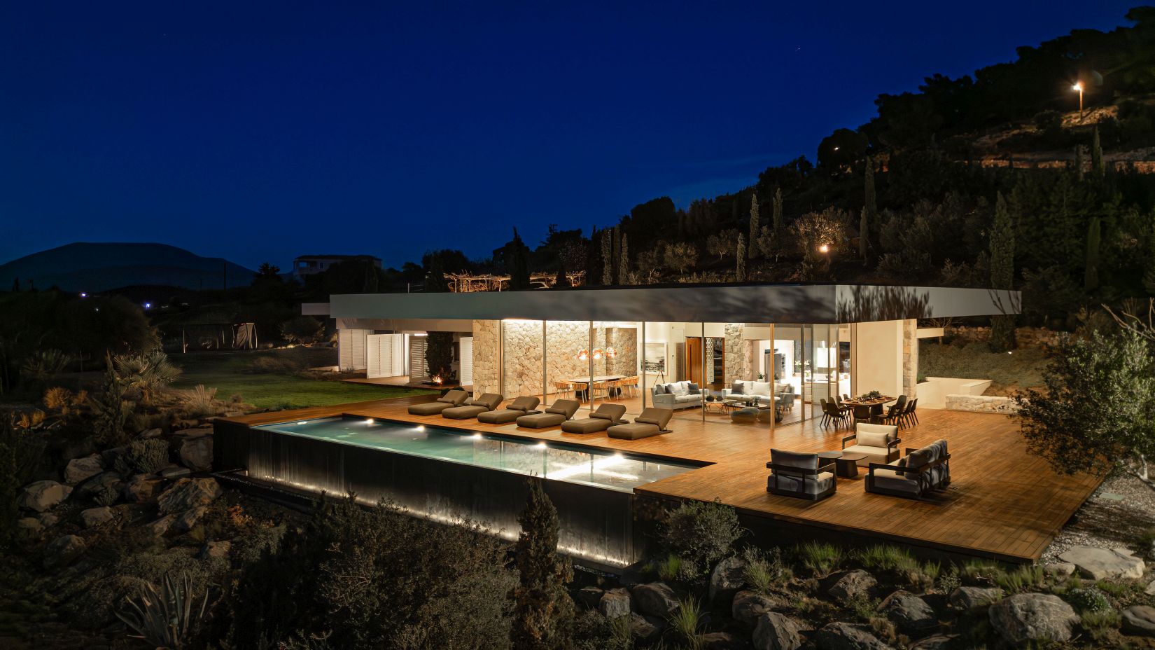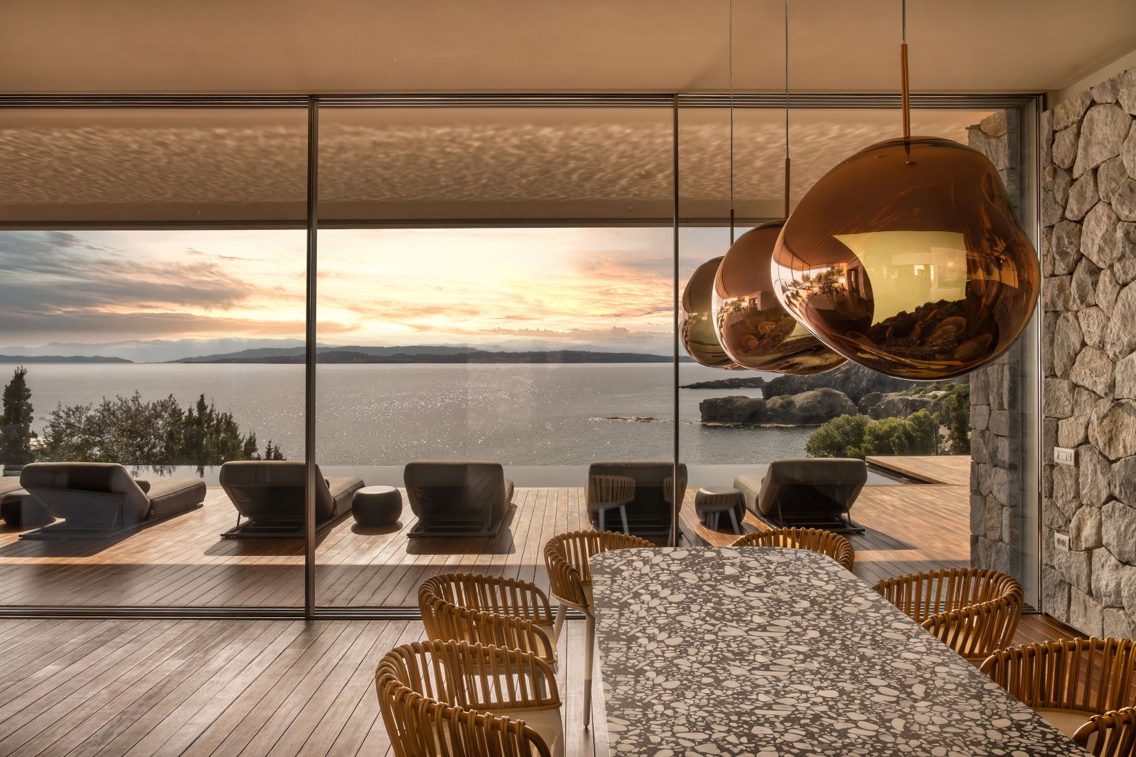 Open-plan living spaces flow seamlessly to the terraces outdoors, where the infinity pool appears to slip into the Aegean. Multiple lounging corners, shaded dining areas, and landscaped pathways leading to the private beach access encourage barefoot living and long afternoons under the Greek sun.