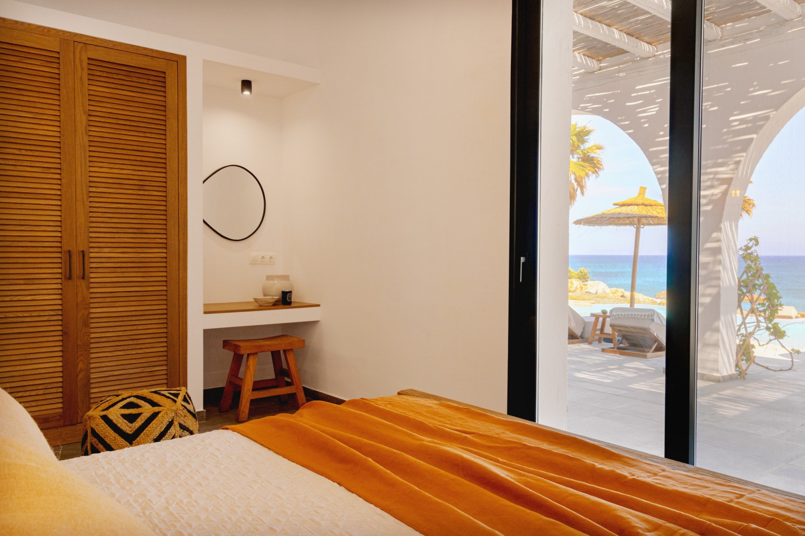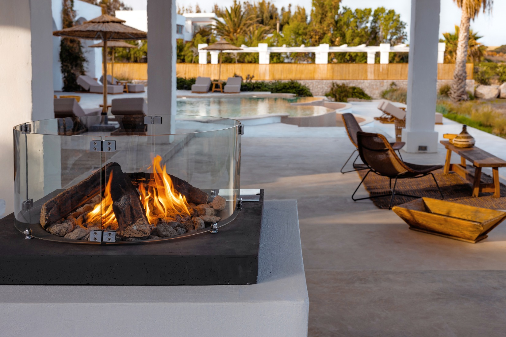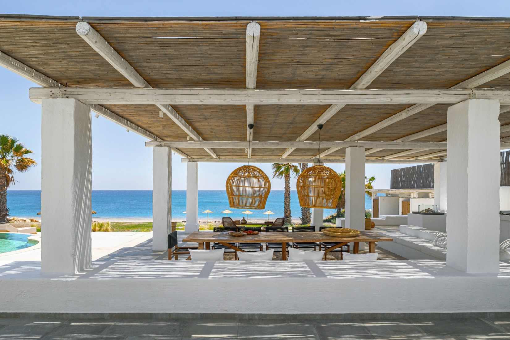 Outdoors, you’ll be captivated by the 100 m² infinity pool overlooking the Aegean Sea, private shaded lounge areas, a relaxing hot tub, and a beachfront fire pit ideal for sunset gatherings. The villa also offers direct access to a magnificent beach with dedicated sunbeds and umbrellas—creating a true sense of barefoot luxury.