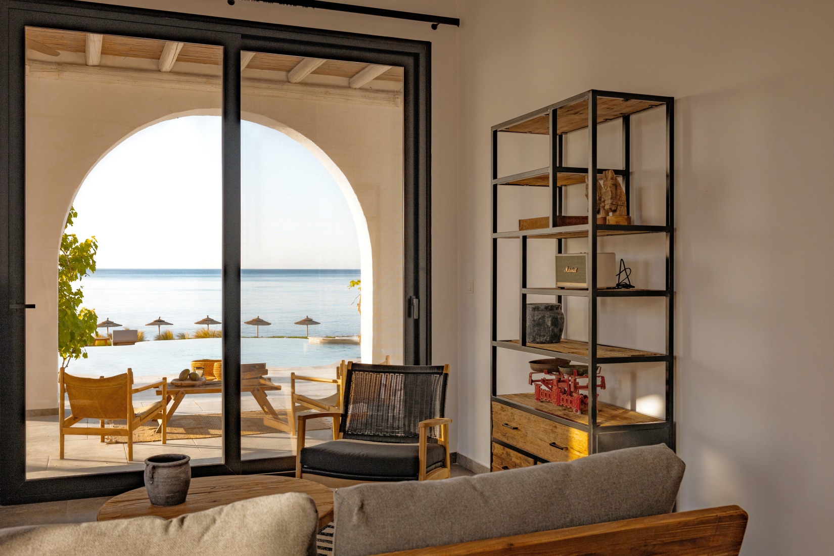Inside, spacious open-plan living areas, a fully equipped modern kitchen, and calming bedrooms with sea views ensure total comfort. The villa also includes a private gym, ideal for guests who want to stay active while enjoying their surroundings.
