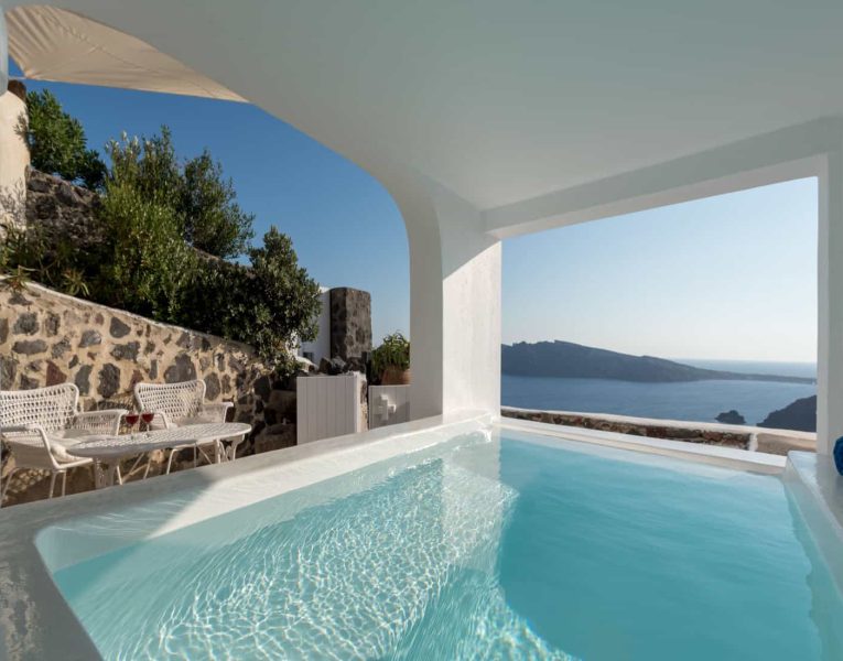 There is an infinity outdoors Jacuzzi plunge pool for 6 persons available on the courtyard of the villa with fabulous views to the sea, the caldera and the village of Oia.